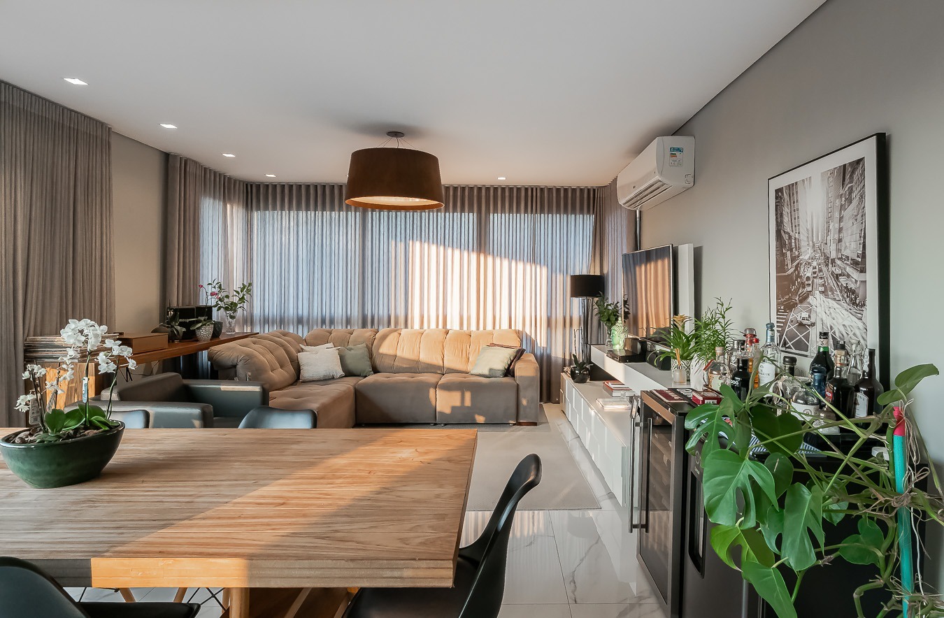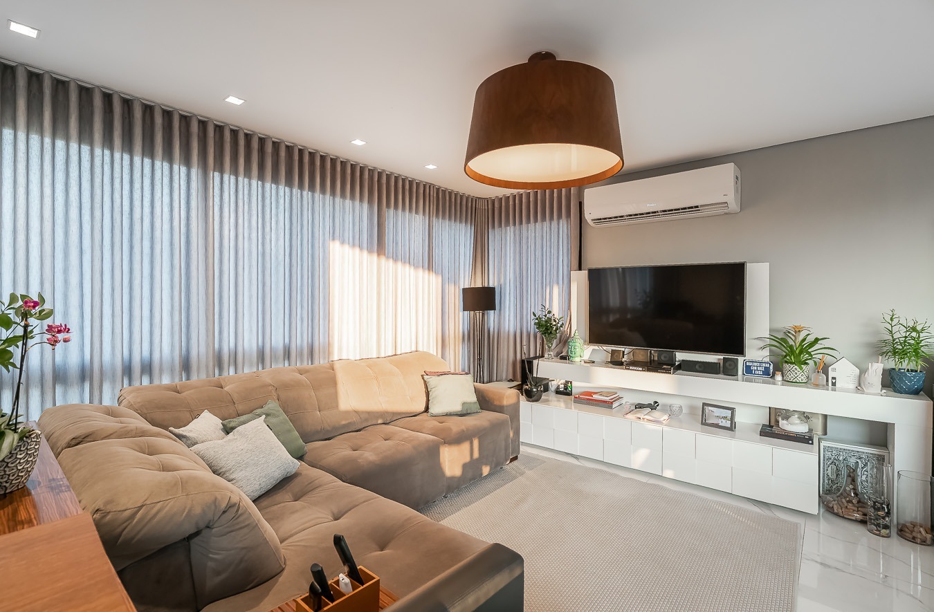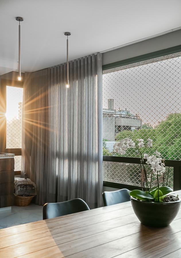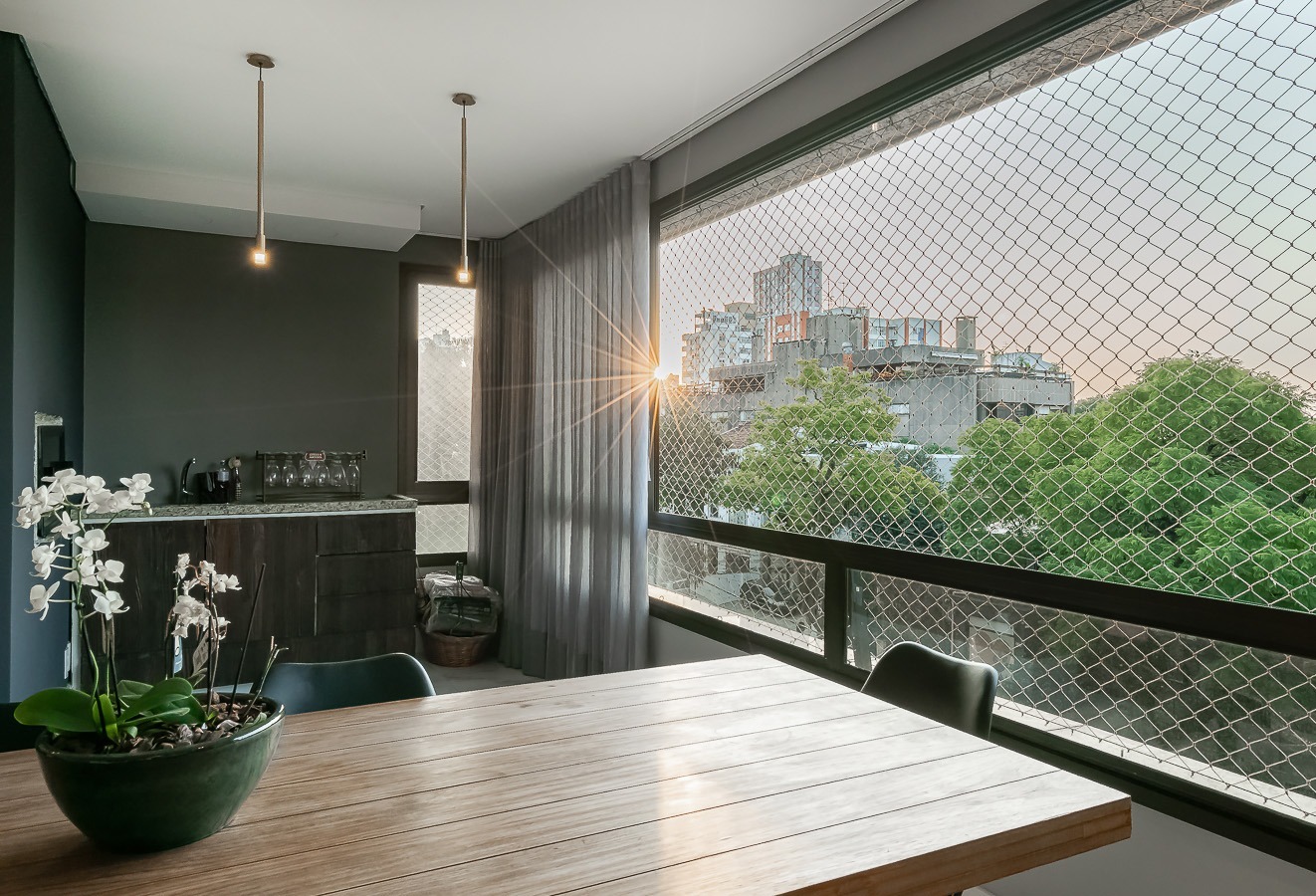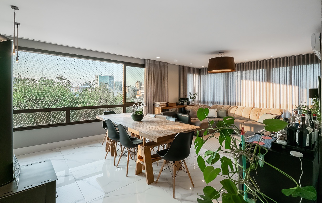 Com vista deslumbrante para o Parcão, living 2 ambientes bem definido, com marcenaria sob medida, sala de estar com esquadrias de vidro duplo com isolamento térmico-acústico, cozinha americana, área de serviço separada.