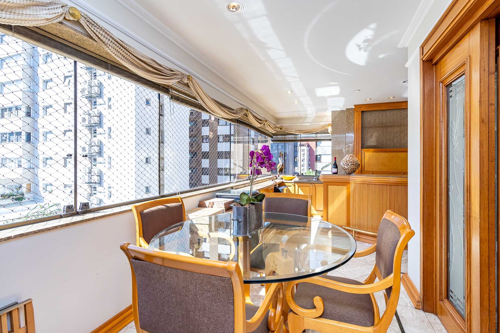 Apartamento para alugar mobiliado com 4 dormitórios, sendo 2 suítes, 179m de área privativa, living com ar condicionado, sacada fechada e ampla com churrasqueira, escrivaninha, cômodas, ventiladores de teto e cortinas, banheiro social com armários, cozinha completa com armários, fogão, geladeira, micro-ondas e coifa e área de serviço.