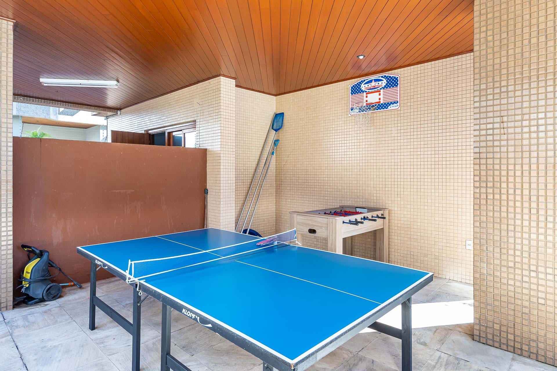 Pavimento inferior com área de serviços, academia, banheiro e opção para o quarto dormitório, além de um depósito que serve de oficina/marcenaria. Garagem coberta para 2 carros.