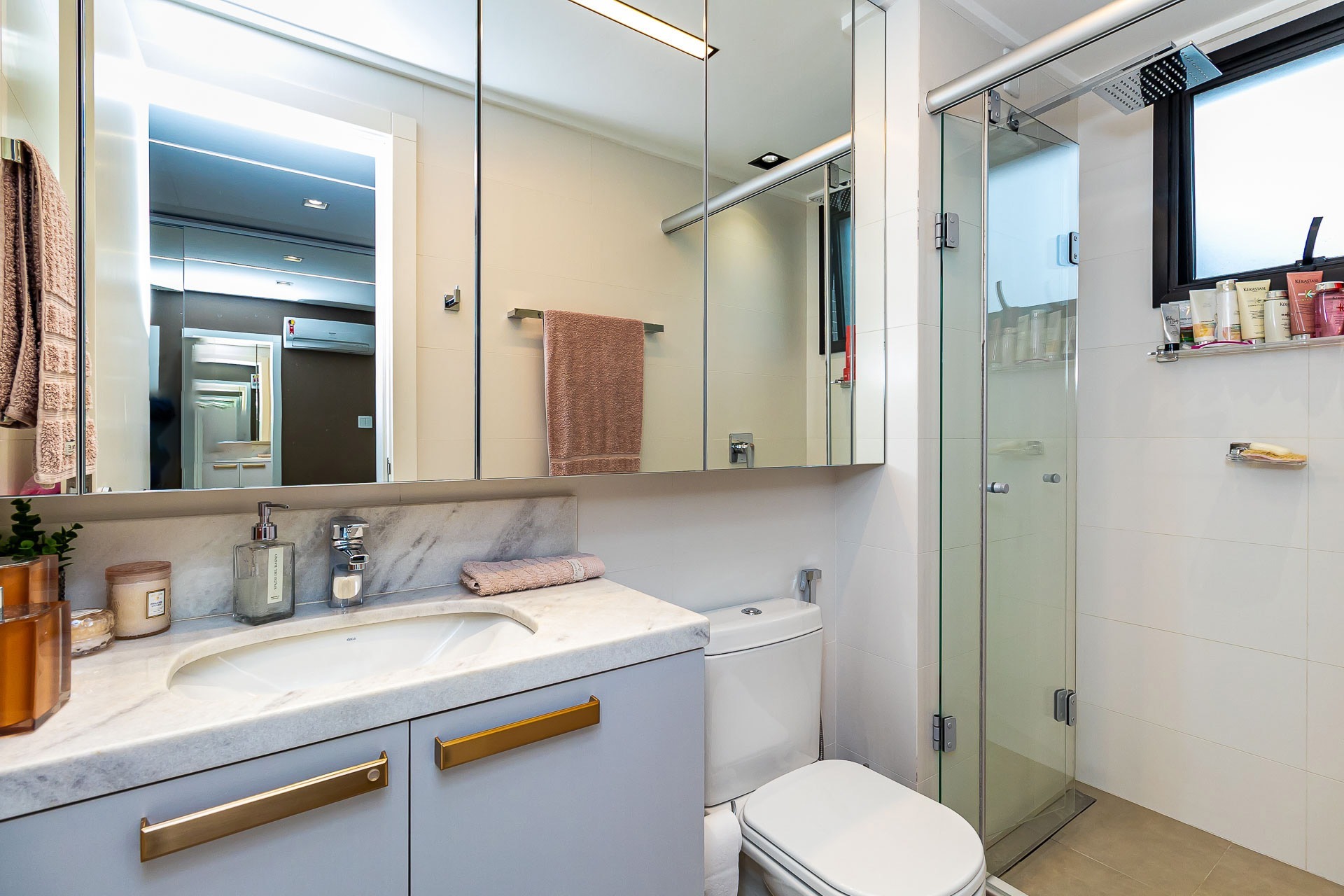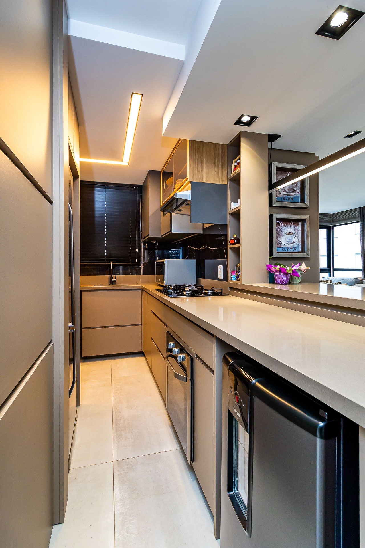 Apartamento semimobiliado com 2 splits, geladeira, fogão cooktop, microondas, aquecedor de passagem, lavabo, lareira, churrasqueira e sacada aberta. Andar alto com vista panorâmica com orientação solar norte.