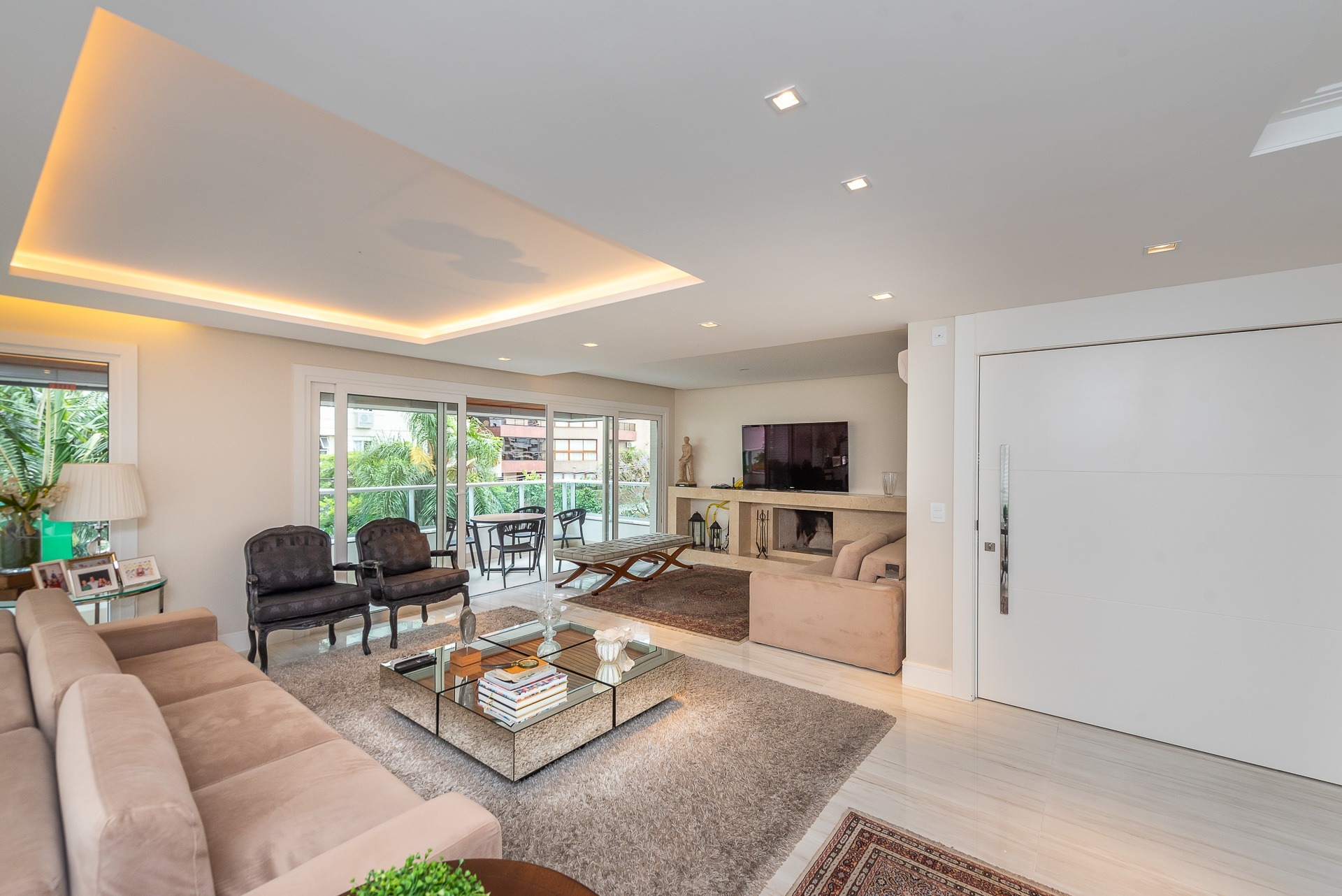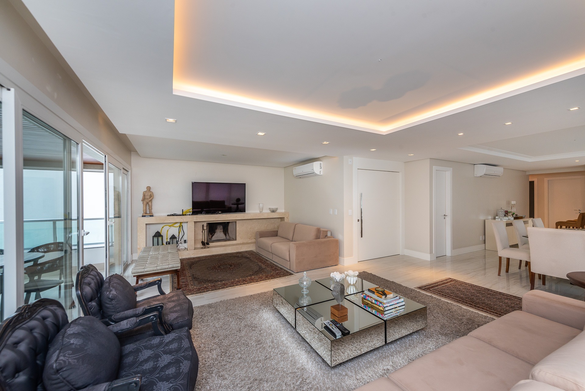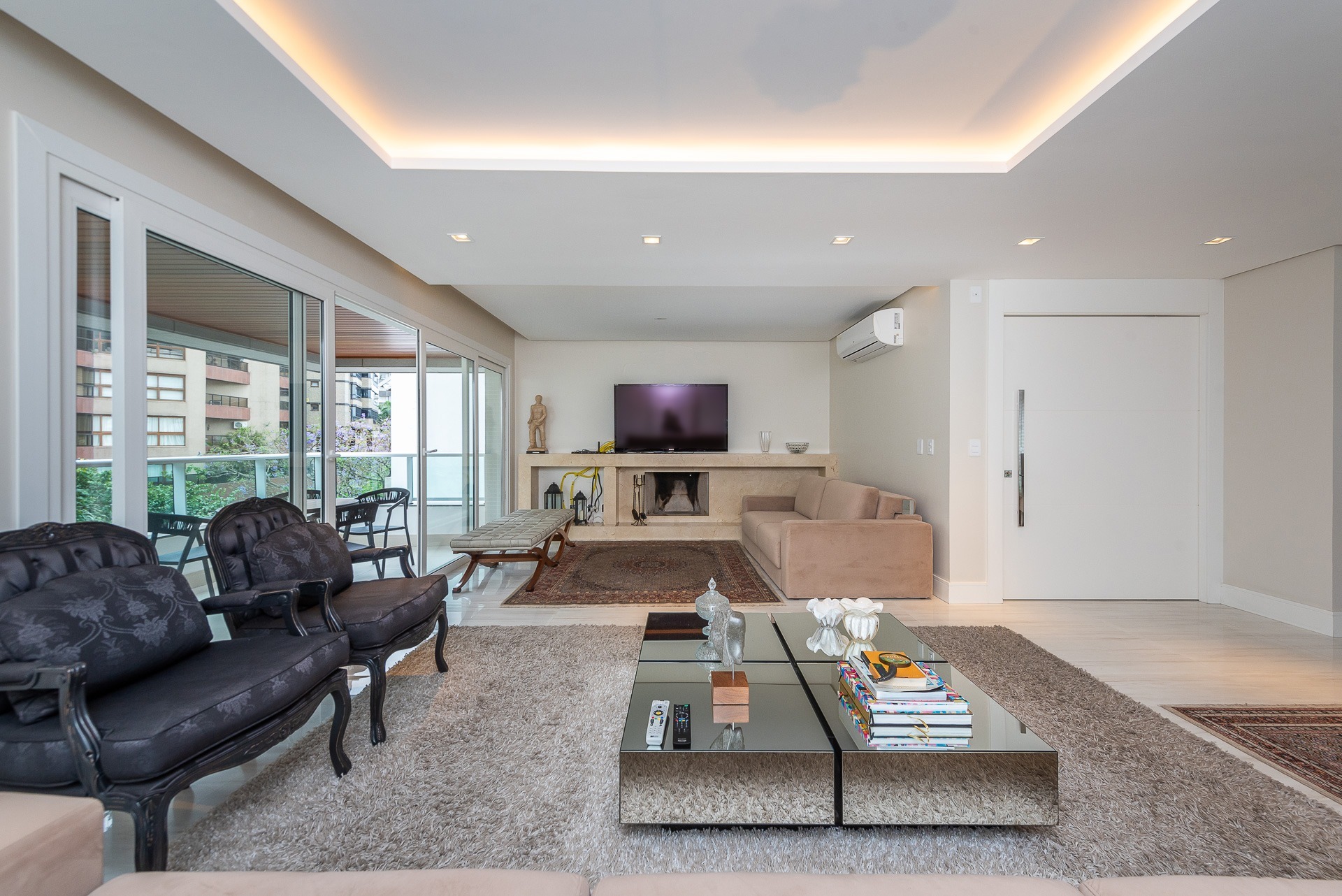 São 4 suítes, living 3 ambientes com lareira, ampla sacada com churrasqueira, lavabo, copa-coz...