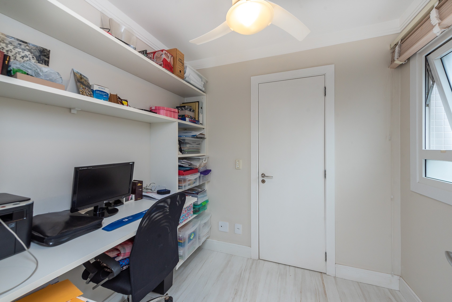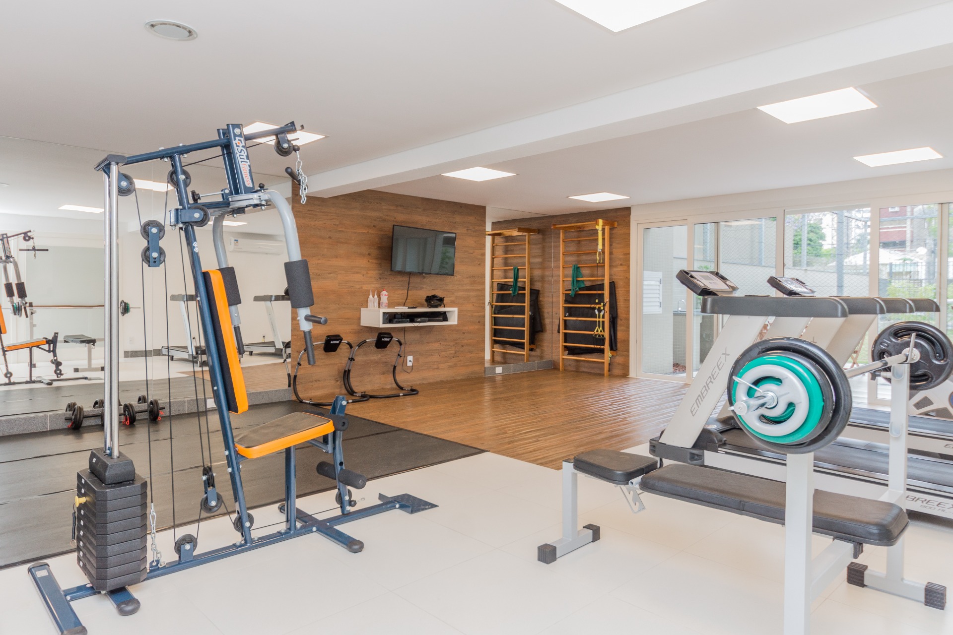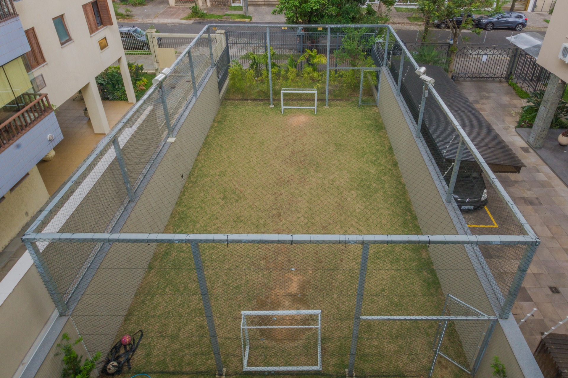 Pavimento inferior com área de serviços, academia, banheiro e opção para o quarto dormitório, além de um depósito que serve de oficina/marcenaria. Garagem coberta para 2 carros.