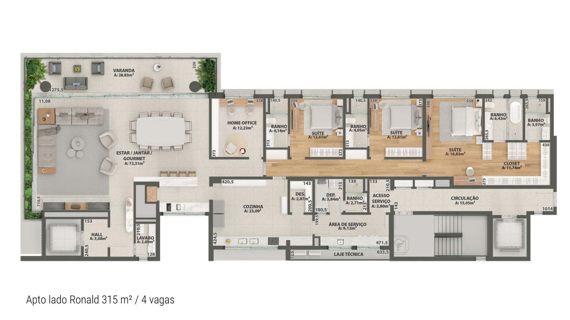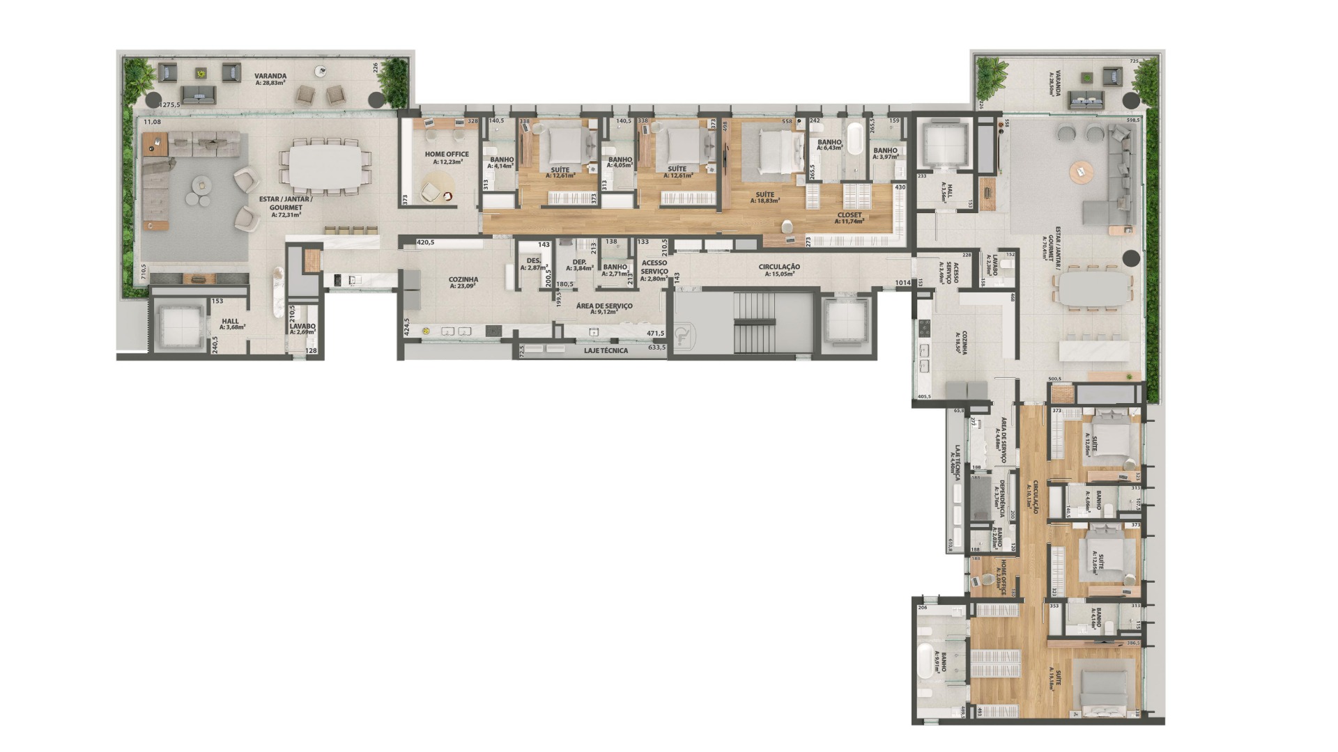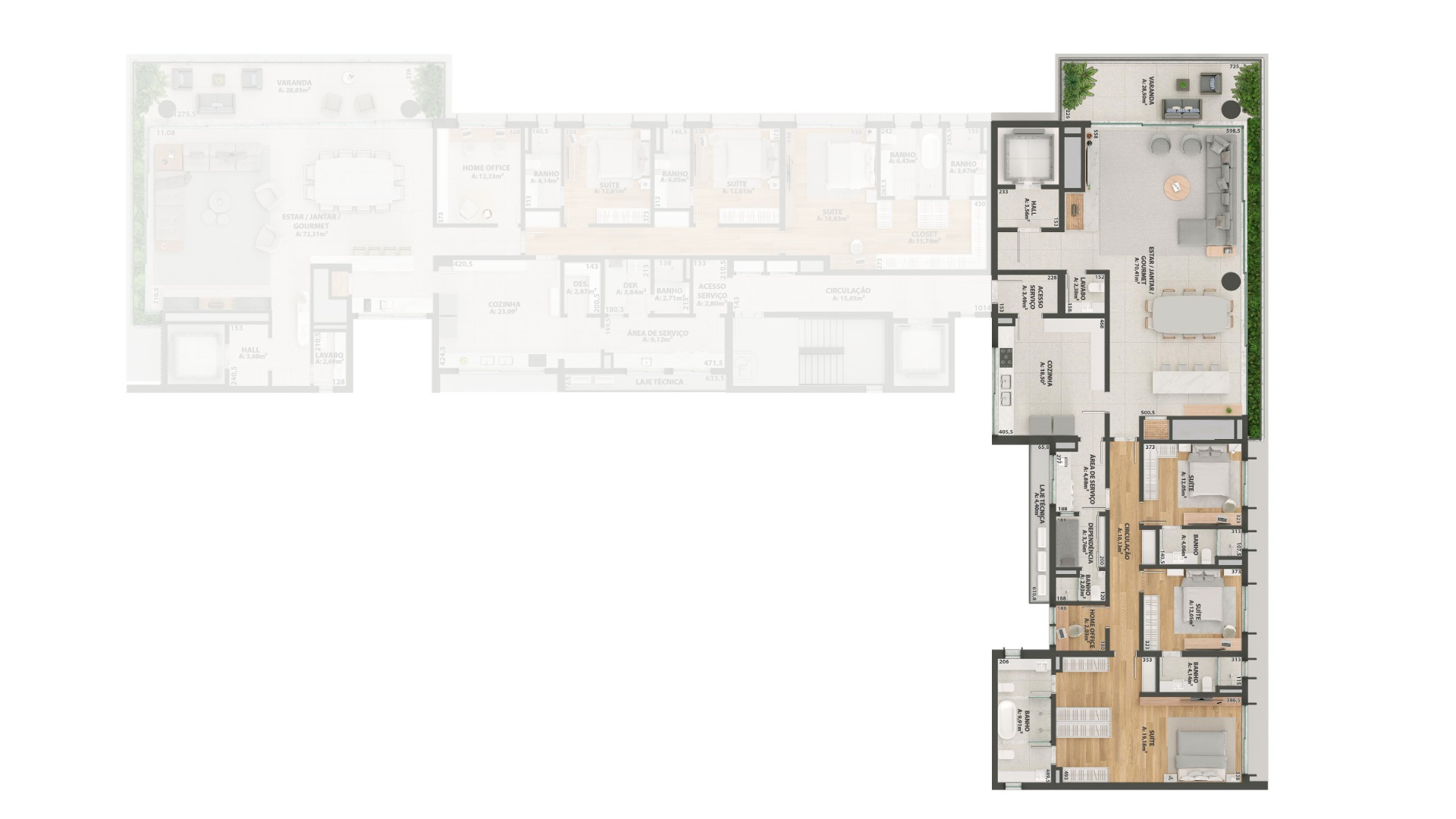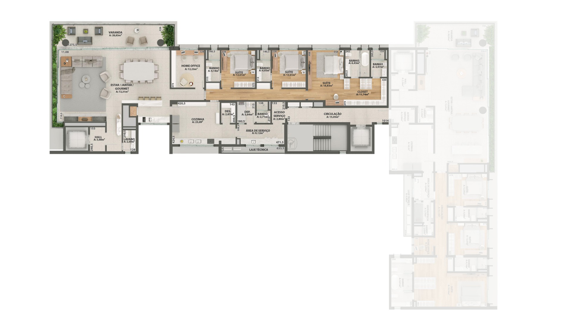 A disposição de 2 apartamentos por andar sem comunicação entre eles garante privacidade, enquanto as opções de 3 ou 4 suítes proporcionam flexibilidade.