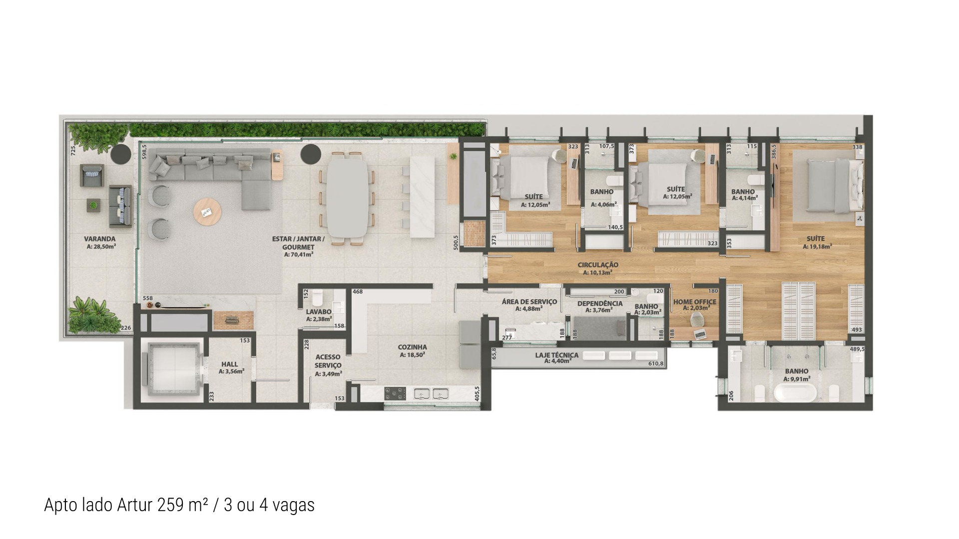 São 3 dormitórios amplos e iluminados, sendo 1 suíte com acesso ao terraço. Living amplo com lareira e espaço gourmet. Home office com total privacidade. Terraço com deck e piscina com vista panorâmica.