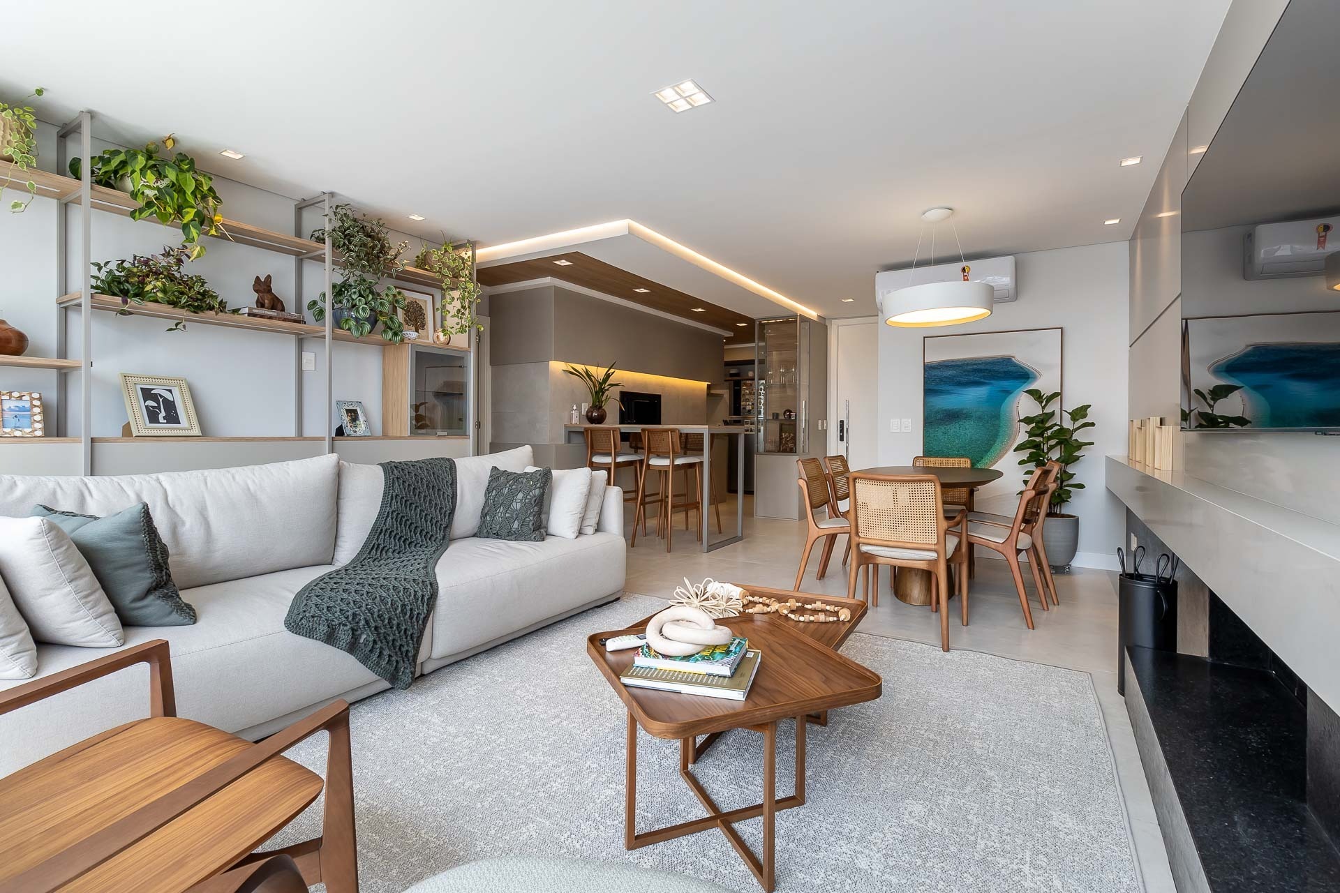 Amplo living com 3 ambientes com lareira, voltado para uma linda área de preservação permanente e panorâmica, churrasqueira gourmet integrada ao living, lavabo, copa cozinha, area de serviço e banheiro auxiliar.