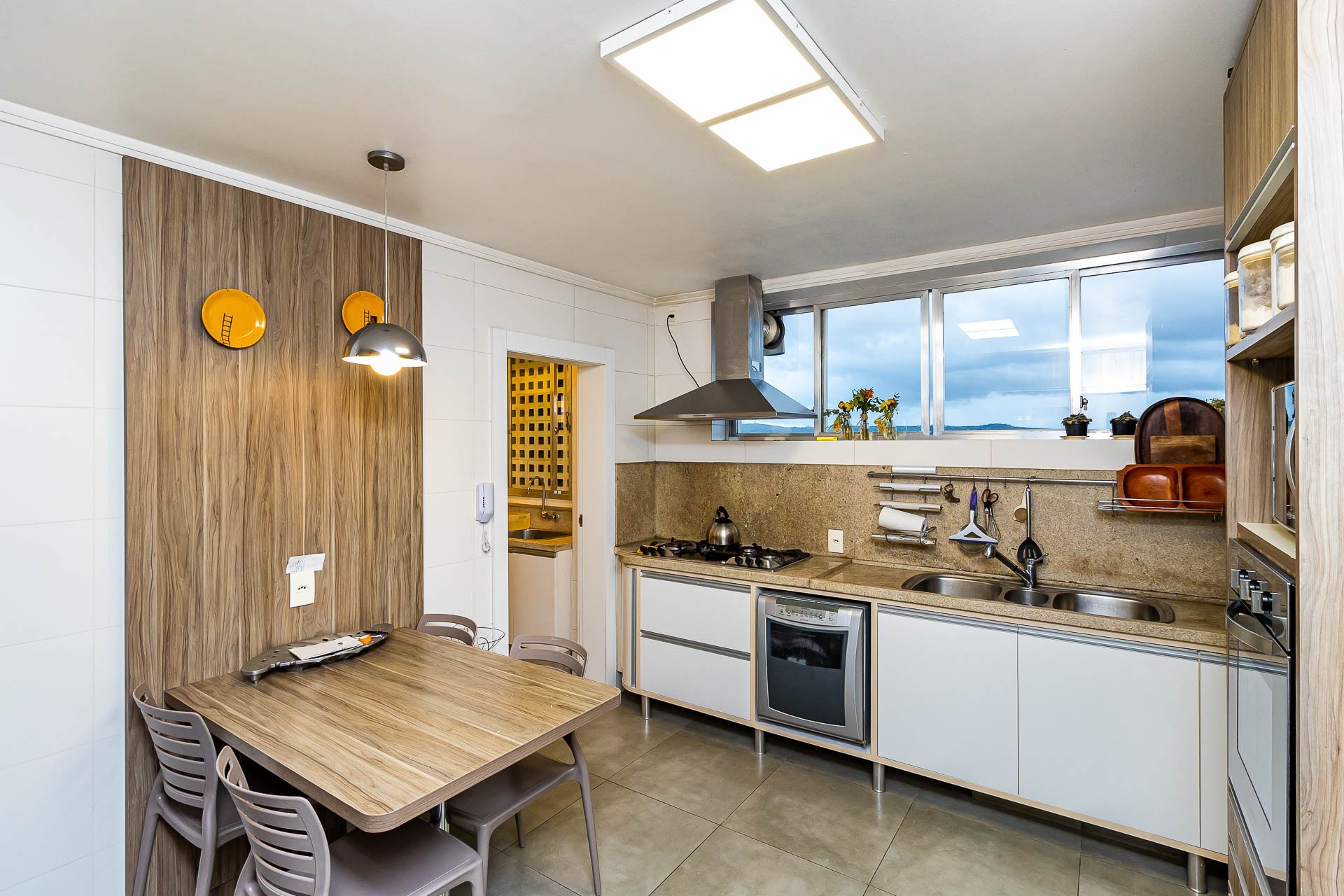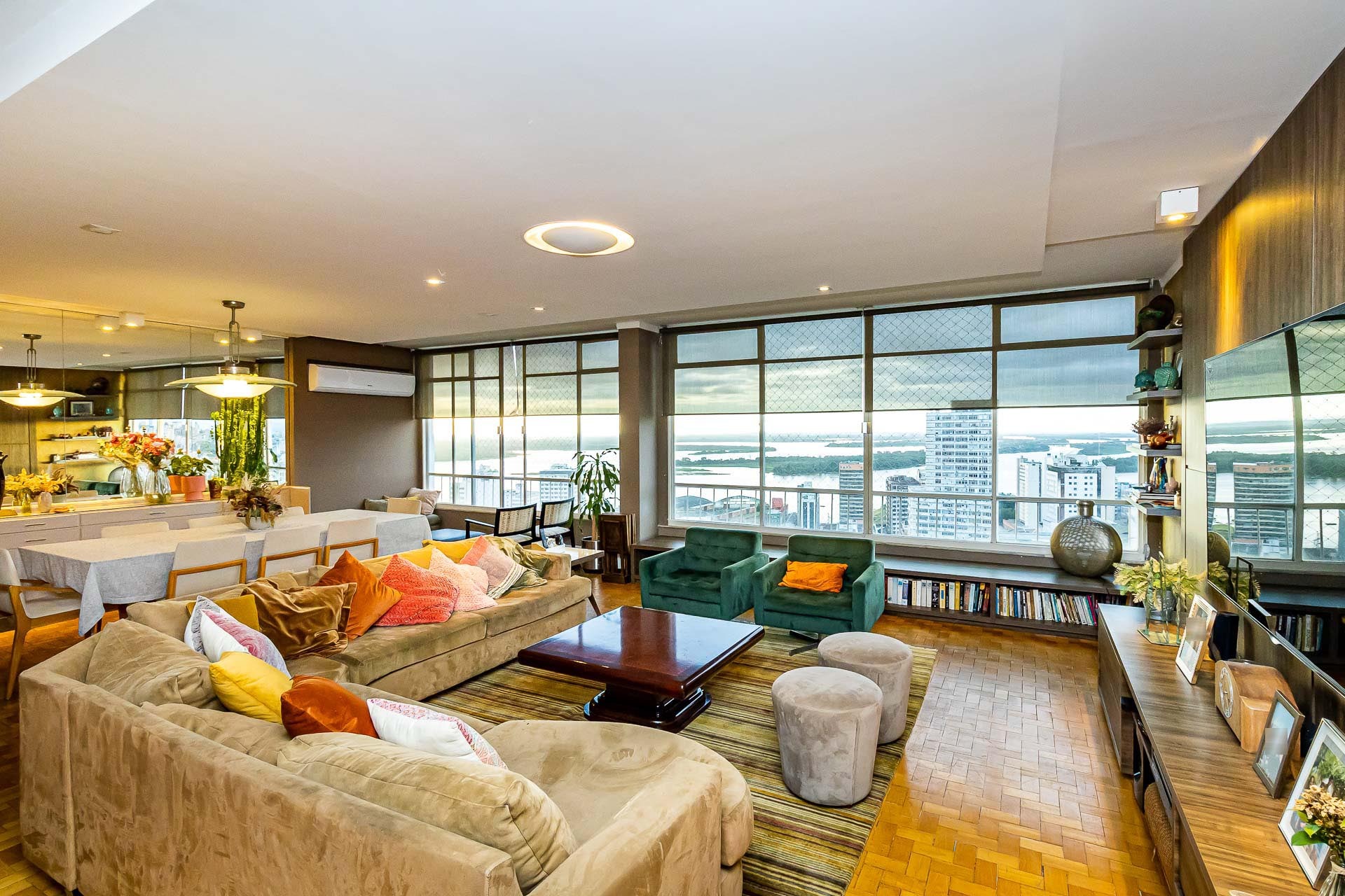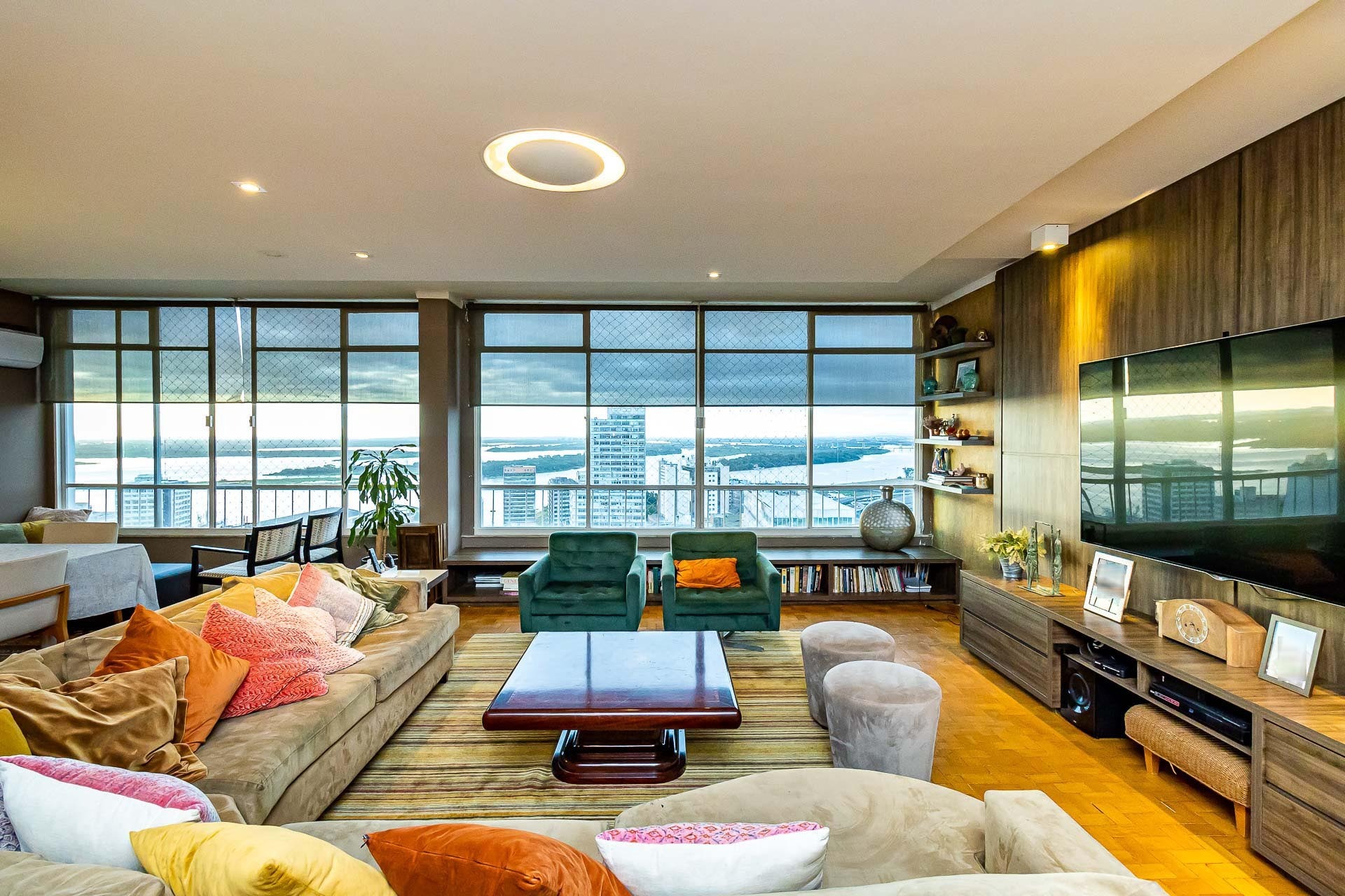 Amplo living com 3 ambientes com lareira, voltado para uma linda área de preservação permanente e panorâmica, churrasqueira gourmet integrada ao living, lavabo, copa cozinha, area de serviço e banheiro auxiliar.