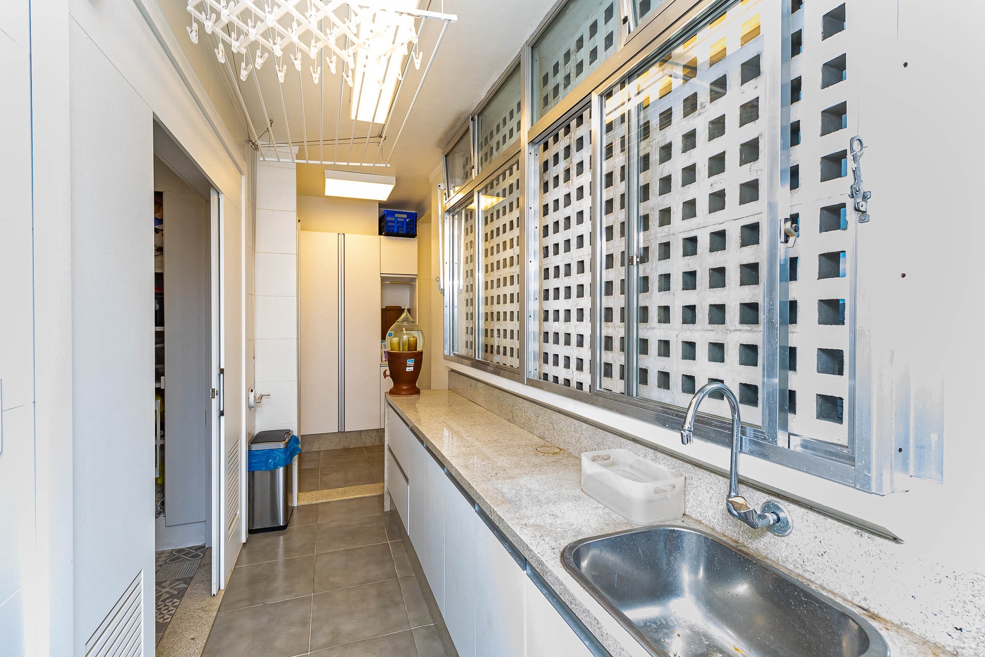 Pavimento inferior com área de serviços, academia, banheiro e opção para o quarto dormitório, além de um depósito que serve de oficina/marcenaria. Garagem coberta para 2 carros.