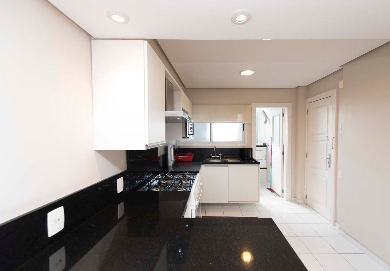 Apartamento para alugar mobiliado com 4 dormitórios, sendo 2 suítes, 179m de área privativa, living com ar condicionado, sacada fechada e ampla com churrasqueira, escrivaninha, cômodas, ventiladores de teto e cortinas, banheiro social com armários, cozinha completa com armários, fogão, geladeira, micro-ondas e coifa e área de serviço.