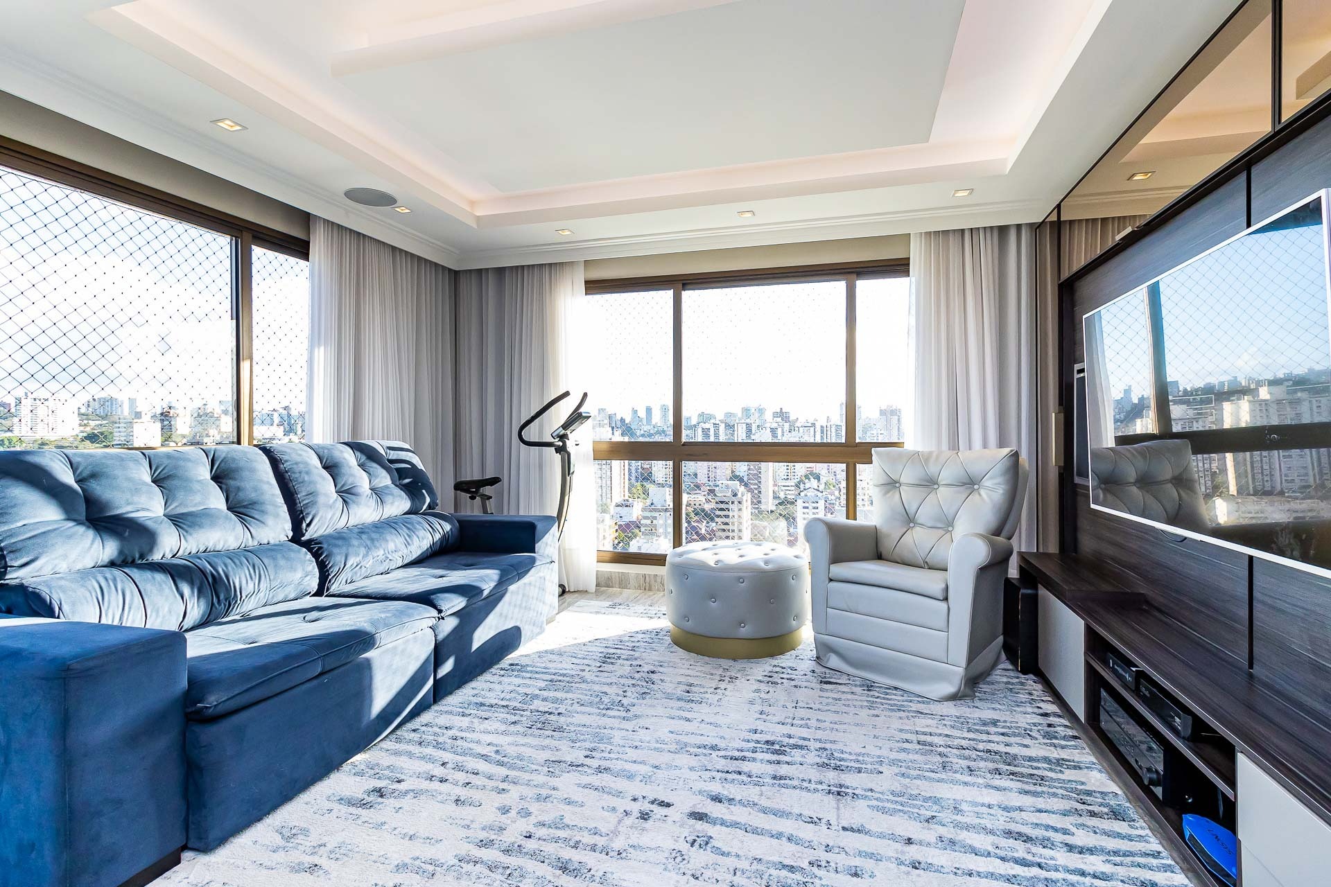 Apartamento para alugar mobiliado com 4 dormitórios, sendo 2 suítes, 179m de área privativa, living com ar condicionado, sacada fechada e ampla com churrasqueira, escrivaninha, cômodas, ventiladores de teto e cortinas, banheiro social com armários, cozinha completa com armários, fogão, geladeira, micro-ondas e coifa e área de serviço.