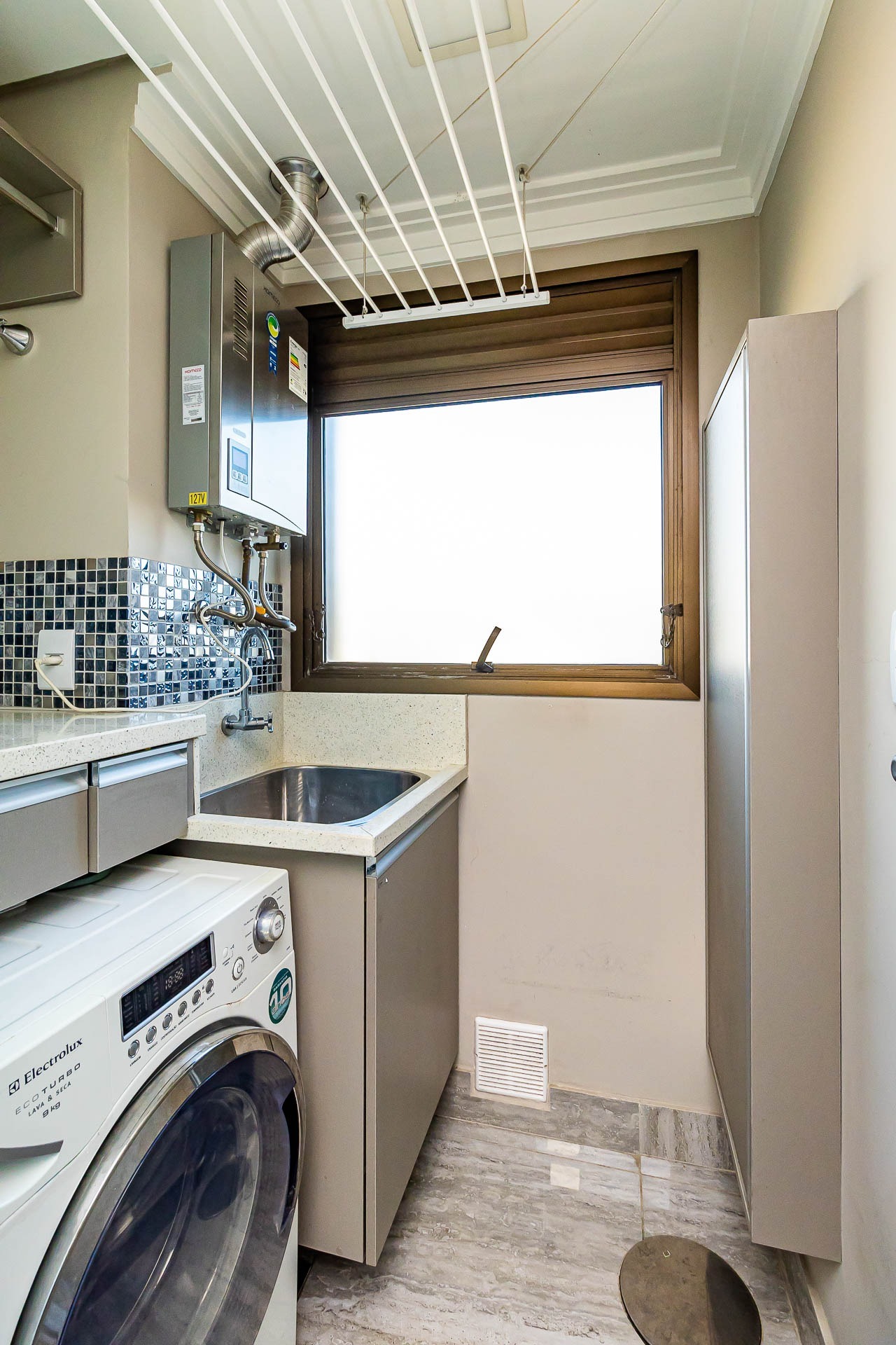 Pavimento inferior com área de serviços, academia, banheiro e opção para o quarto dormitório, além de um depósito que serve de oficina/marcenaria. Garagem coberta para 2 carros.