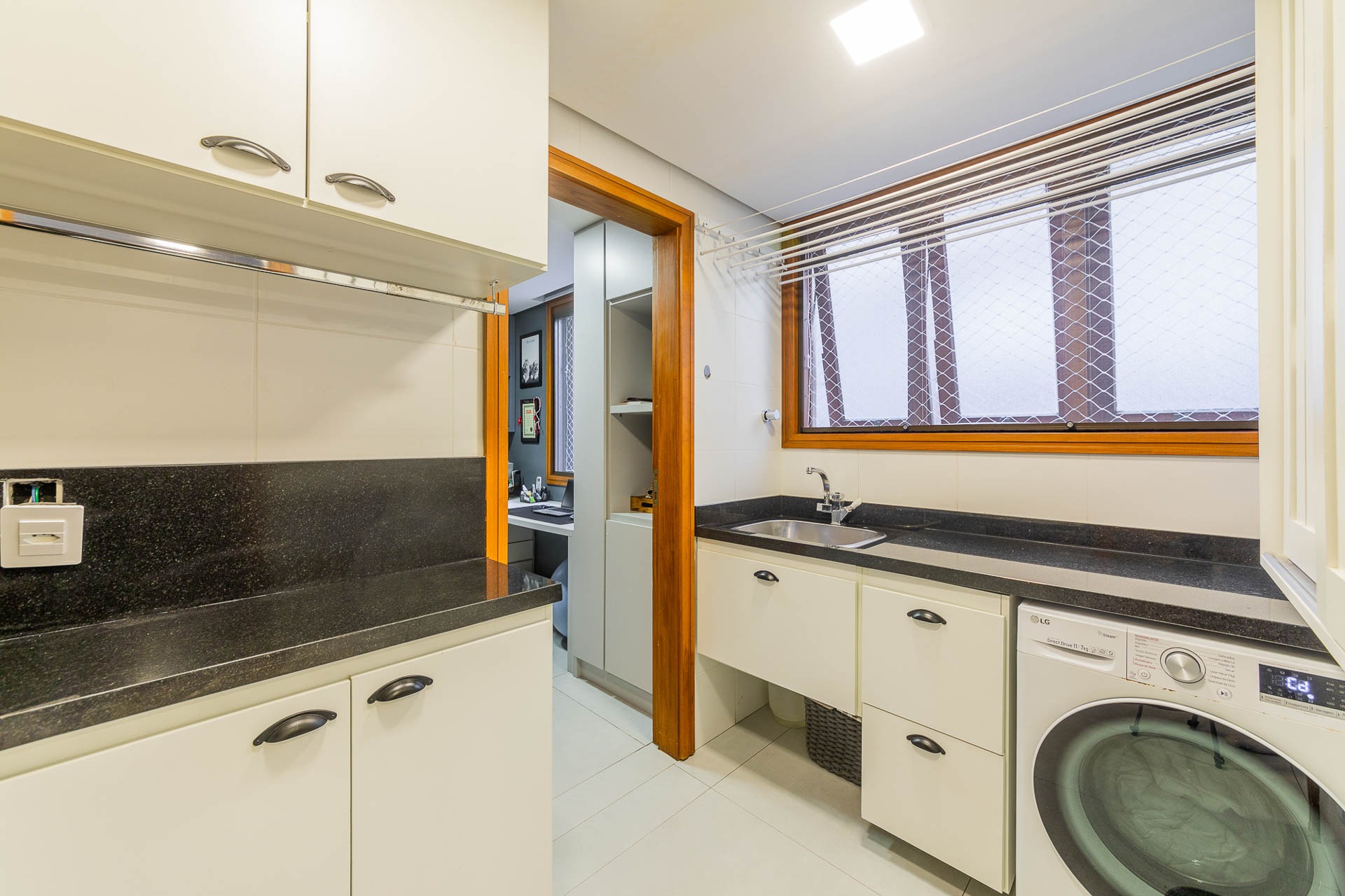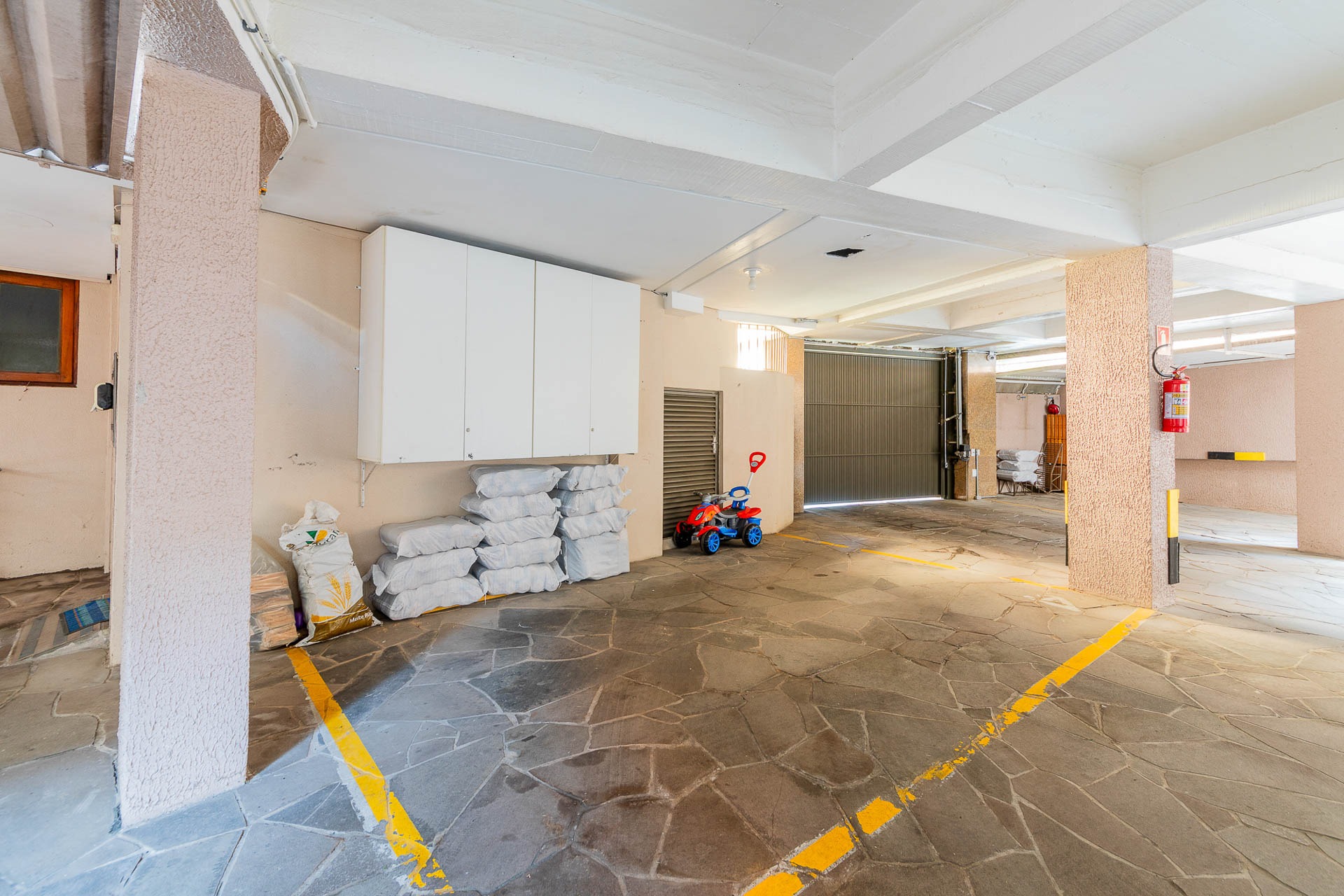 Pavimento inferior com área de serviços, academia, banheiro e opção para o quarto dormitório, além de um depósito que serve de oficina/marcenaria. Garagem coberta para 2 carros.