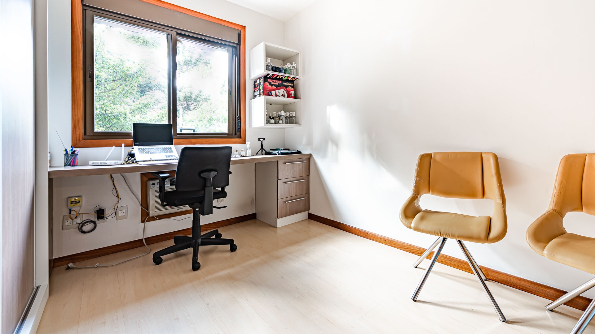 Pavimento inferior com área de serviços, academia, banheiro e opção para o quarto dormitório, além de um depósito que serve de oficina/marcenaria. Garagem coberta para 2 carros.