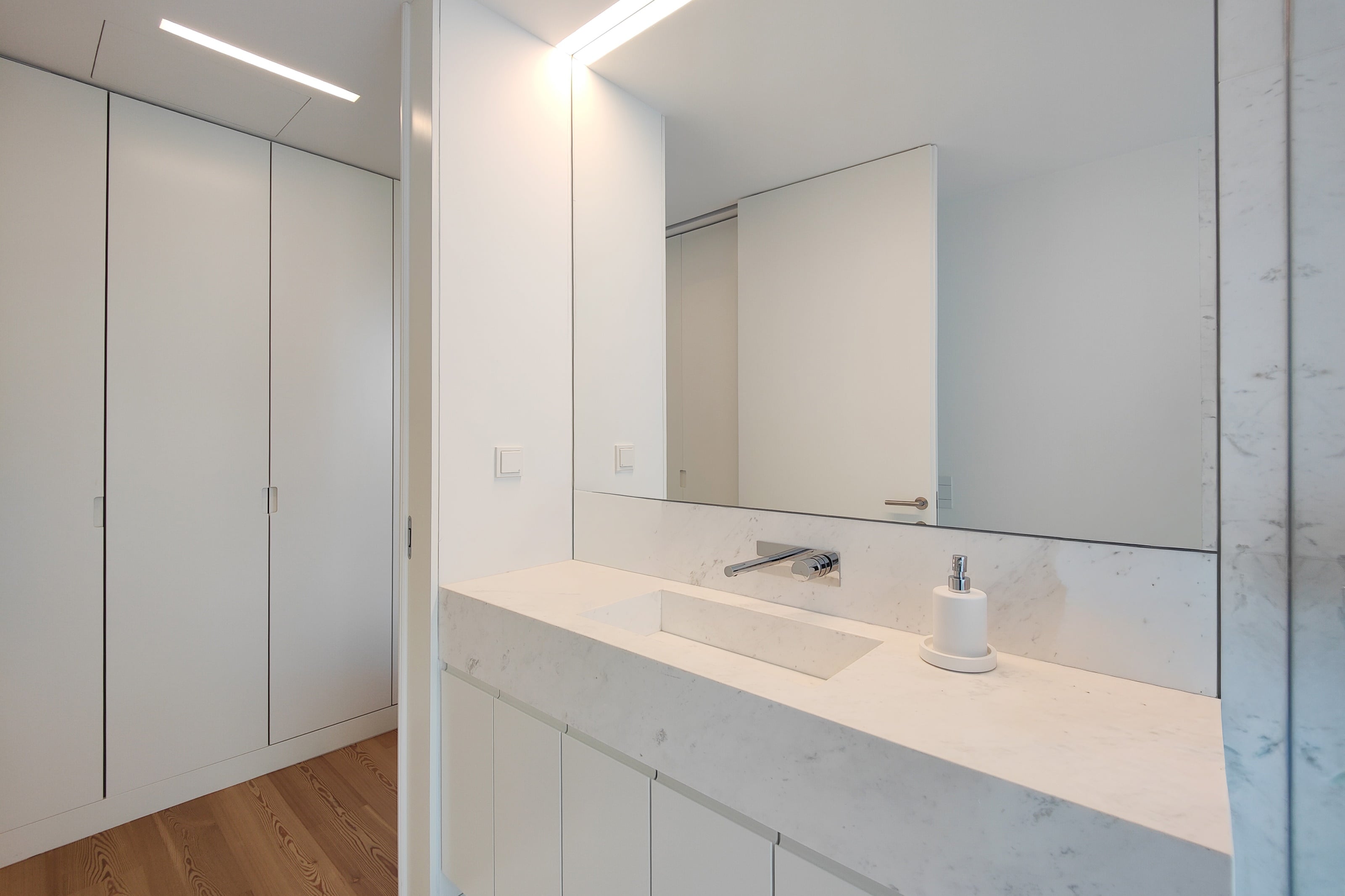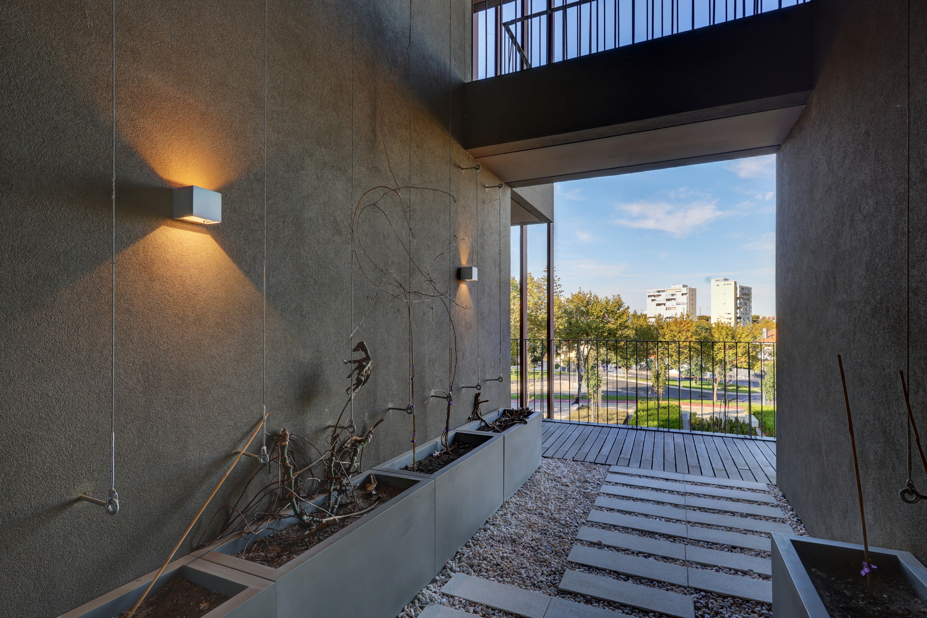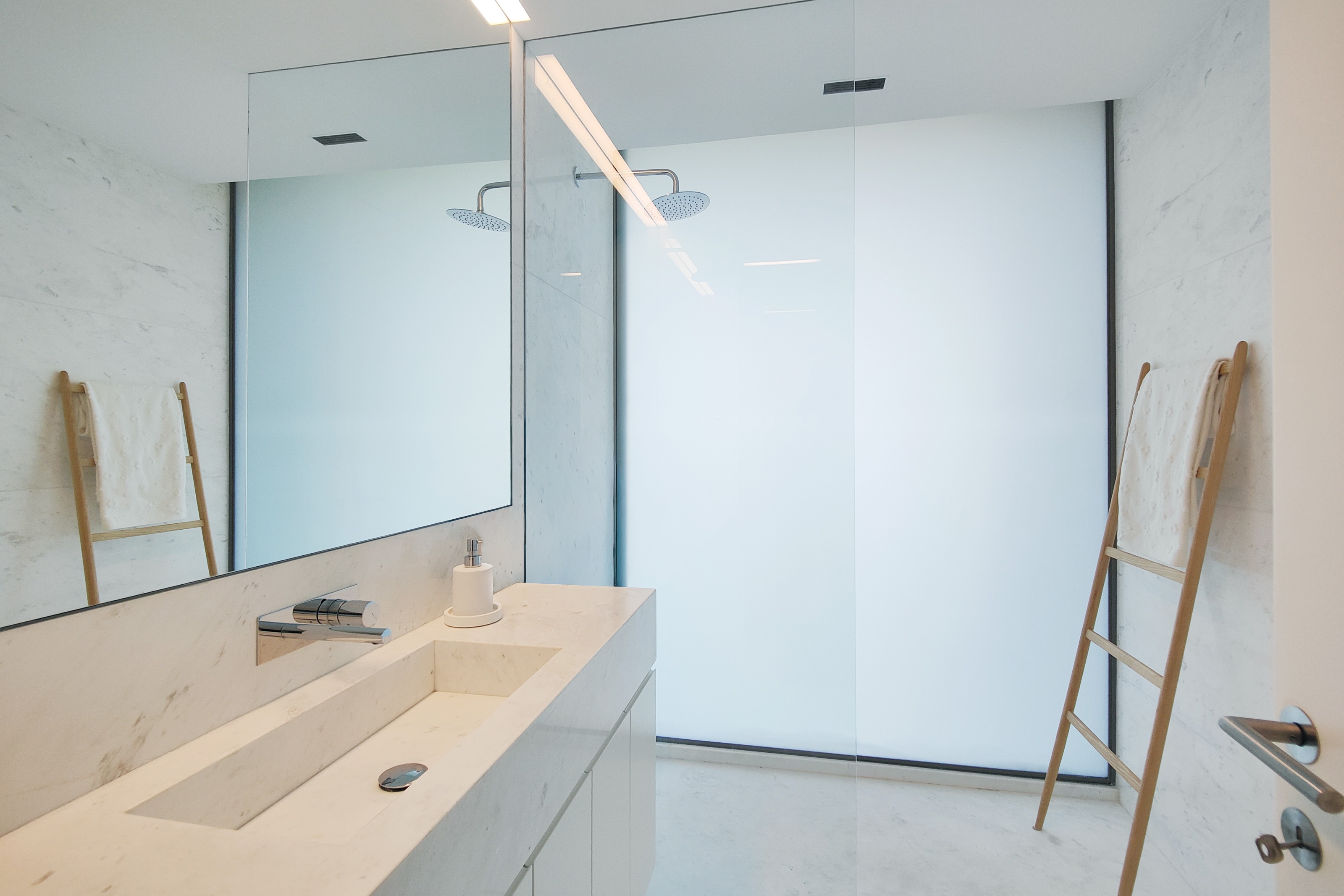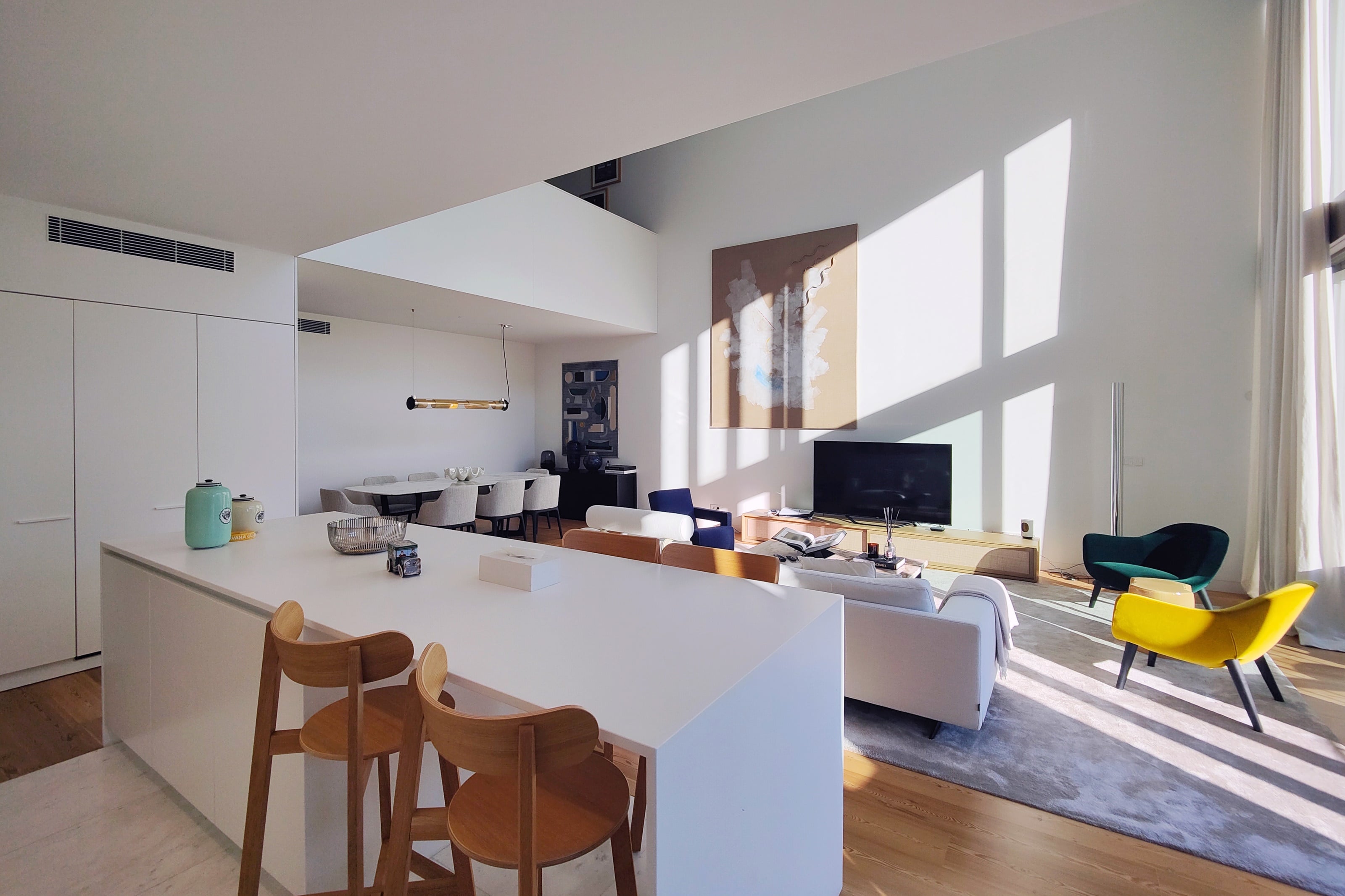 - No primeiro piso uma ampla sala com duplo pé direito, cozinha aberta e acesso a uma grande varanda, 1 suite, igualmente com varanda, lavandaria, casa de banho social e um jardim de inverno.
