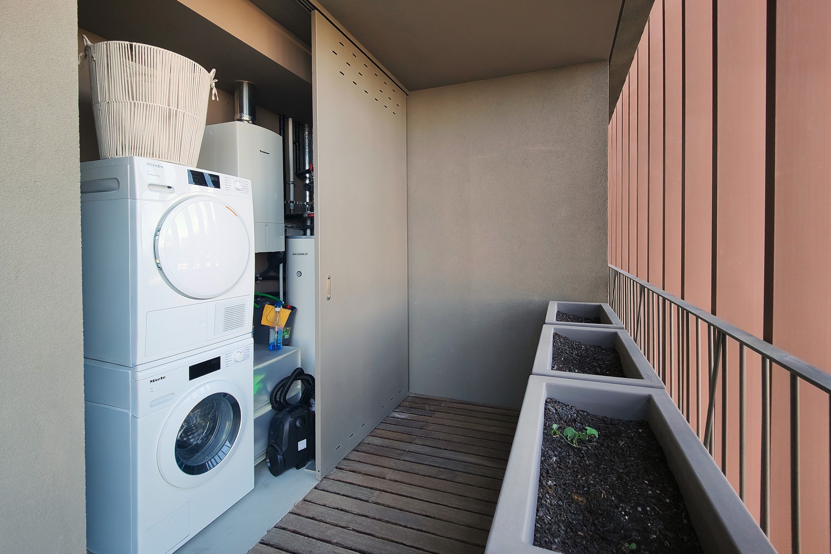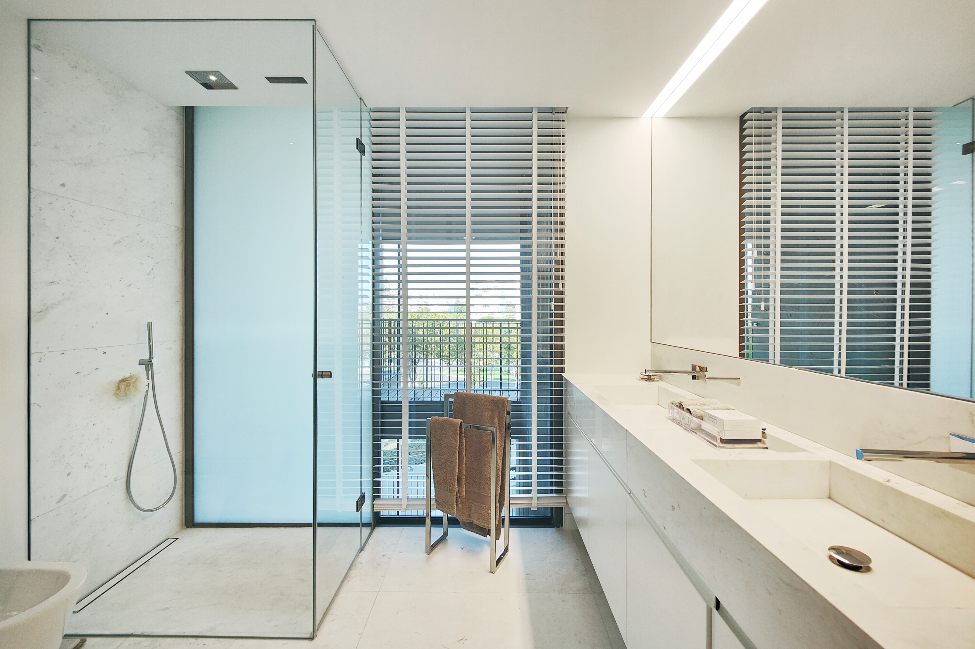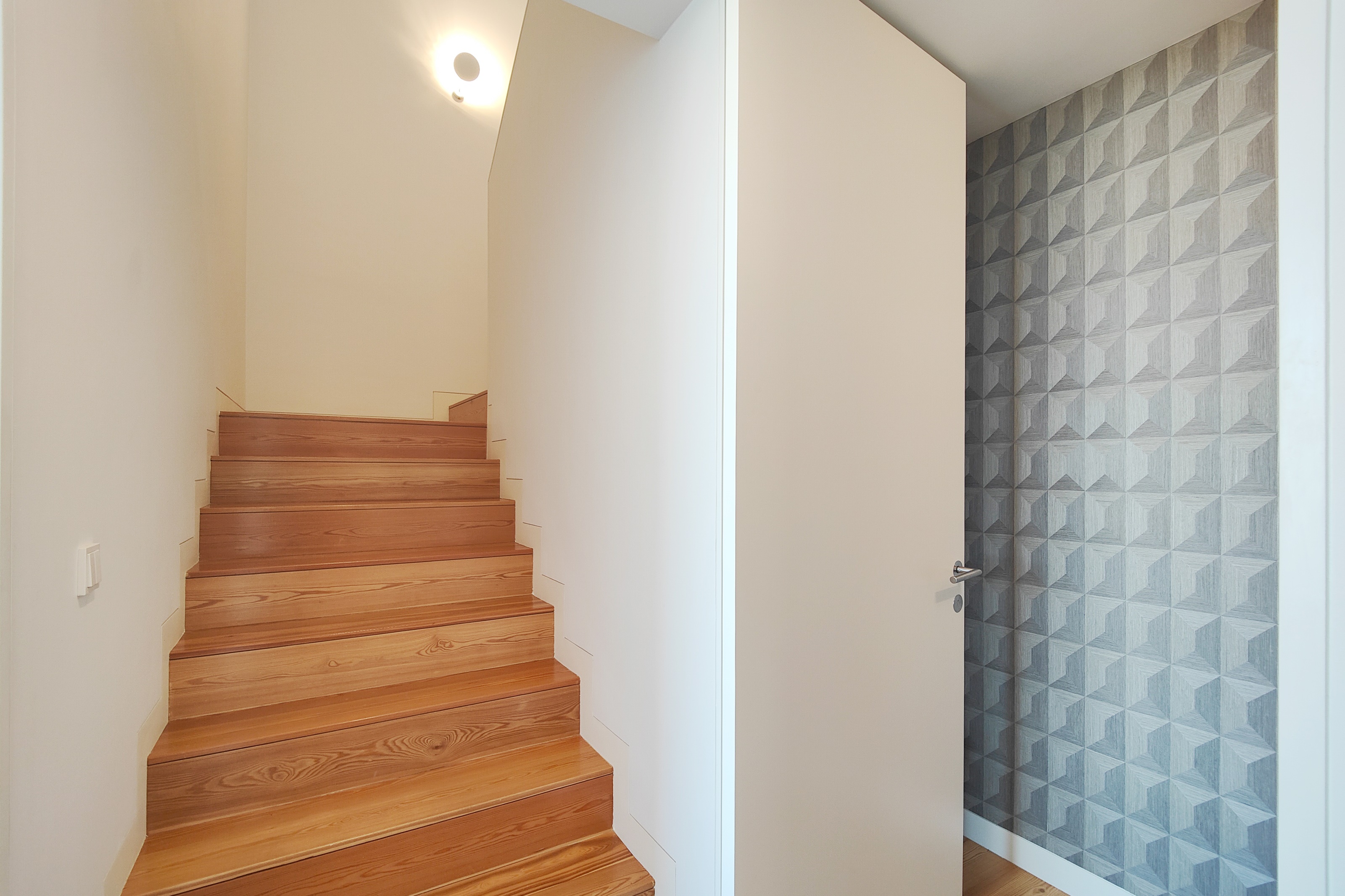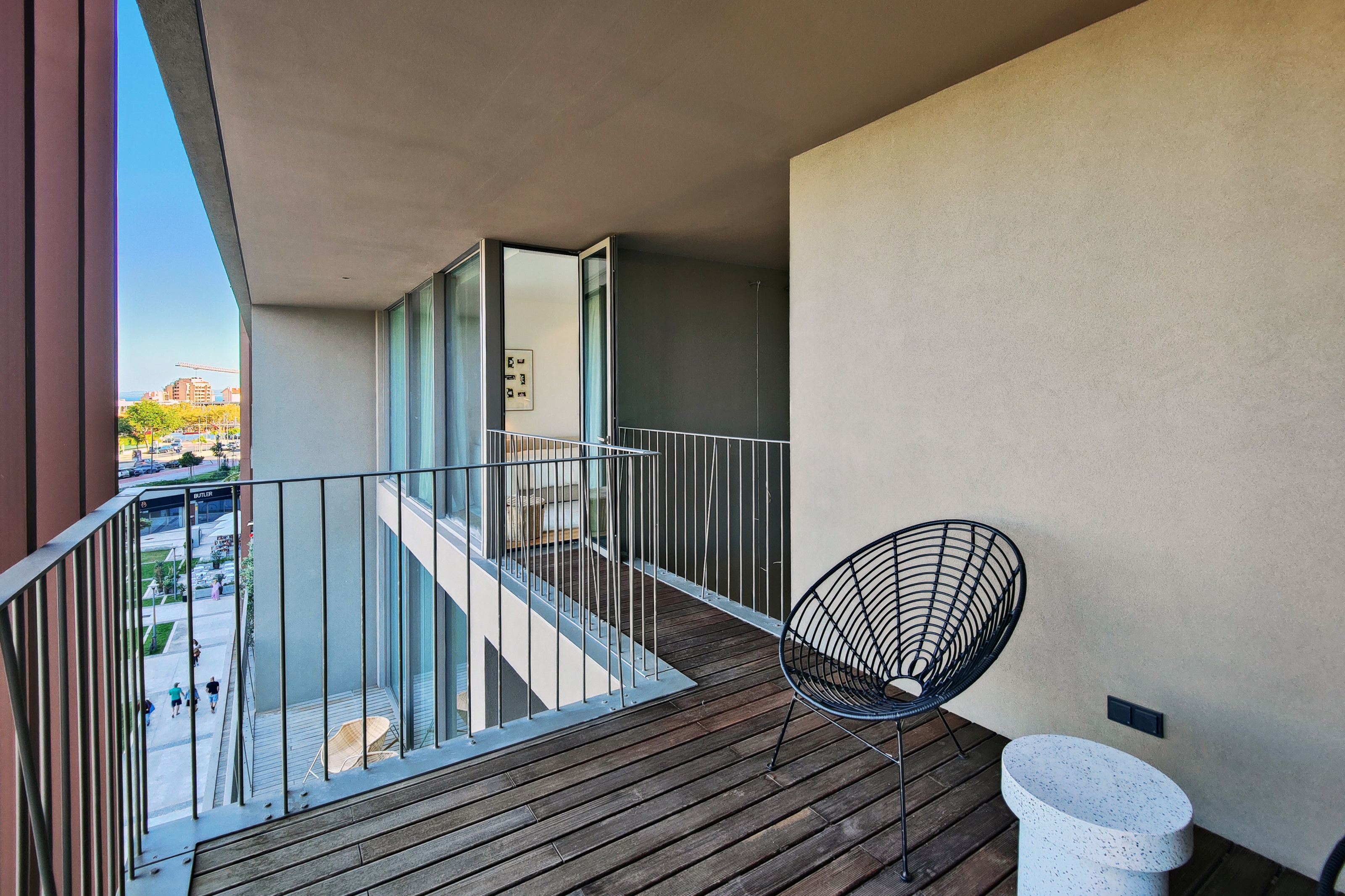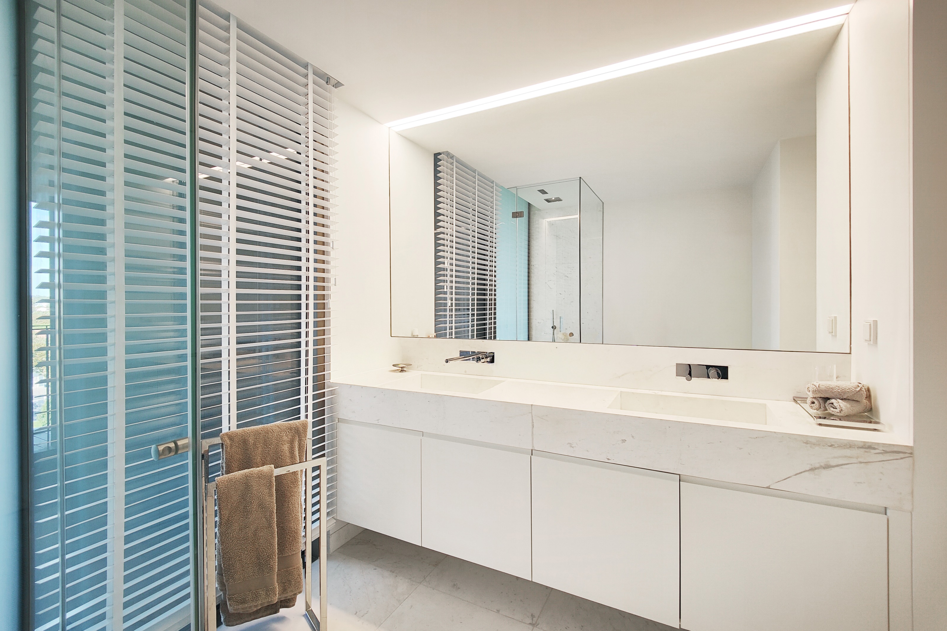 - No primeiro piso uma ampla sala com duplo pé direito, cozinha aberta e acesso a uma grande varanda, 1 suite, igualmente com varanda, lavandaria, casa de banho social e um jardim de inverno.
