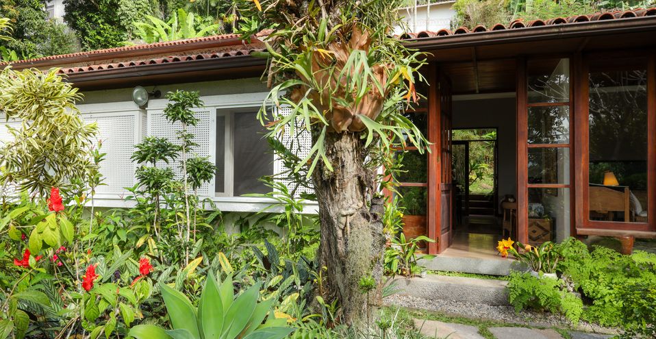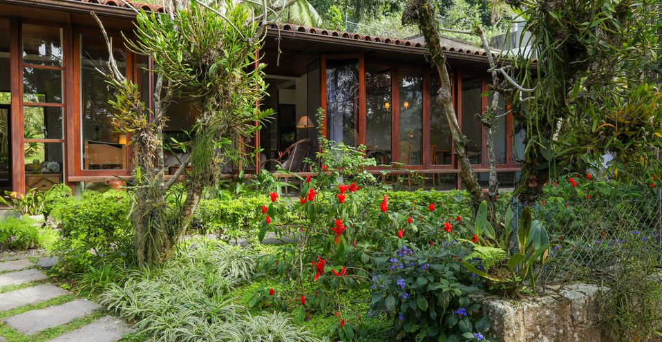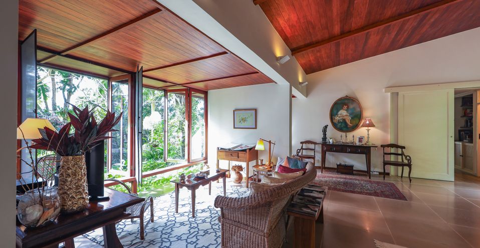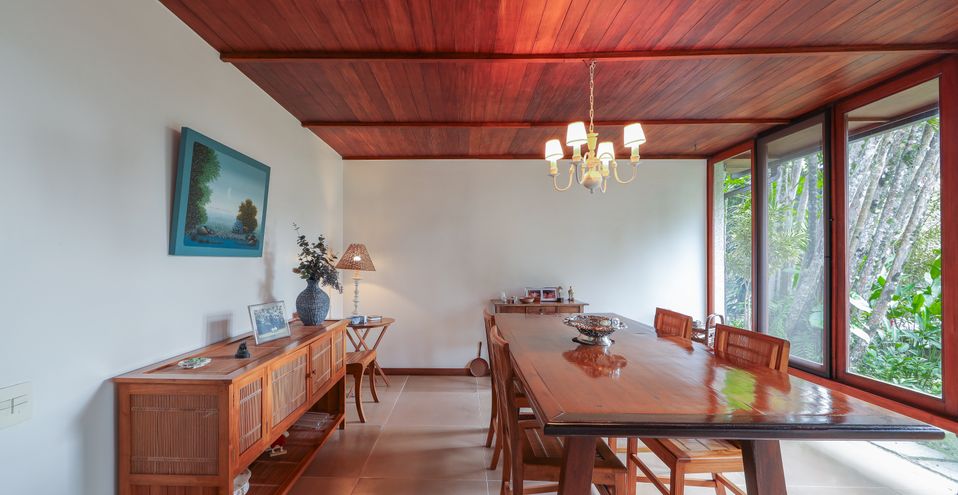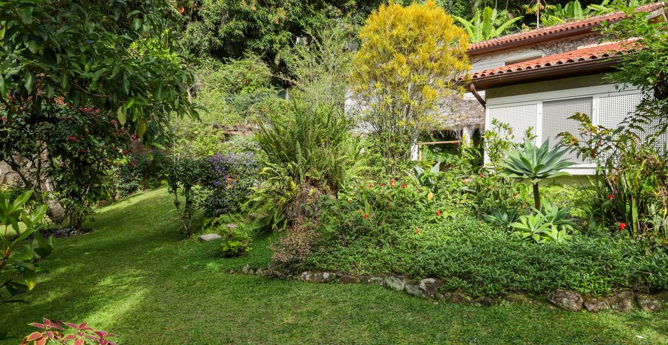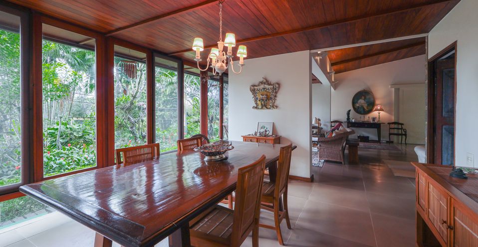 Encantadora residência em terreno gramado em platô, envolvida em natureza exuberante, silenciosa e Solar, em condomínio de luxo.