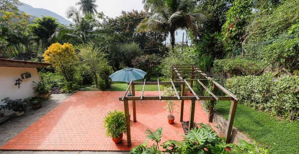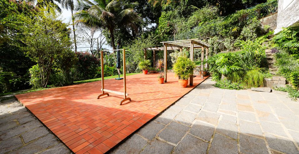 No jardim, existe uma área plana pavimentada, que anteriormente foi uma piscina e que hoje foi transformada em cisterna, é usada como um solarium, podendo retornar a piscina.