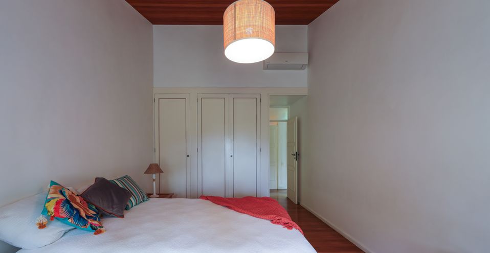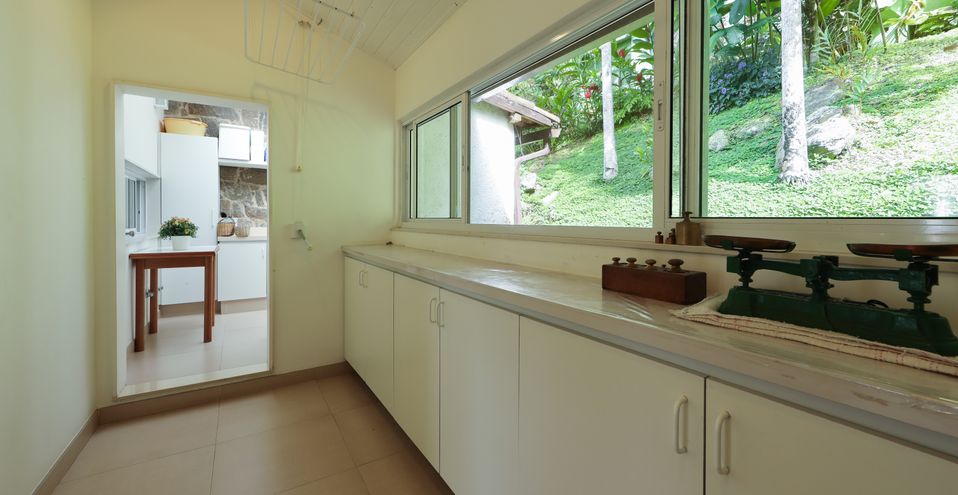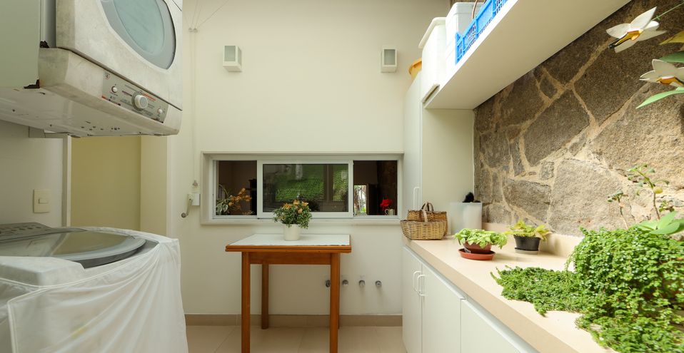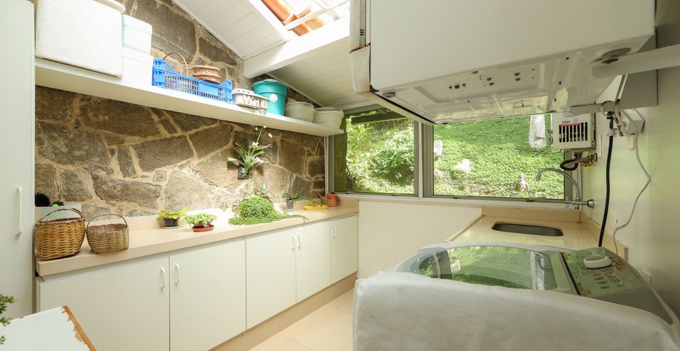 Ainda no térreo, dois quartos confortáveis com pé direito alto e armários, banheiro espaçoso completo, lavanderia muito iluminada e excelente dependência de empregados.