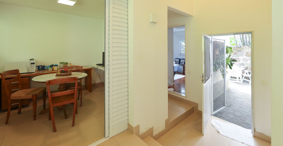 A sala é agradabilíssima, possui pé direito alto, toda envidraçada para o jardim florido, composta por ambientes dois ambientes de estar e um formal de jantar, excelente cozinha, clara e funcional, repleta de armários com ampla bancada, com copa separada.