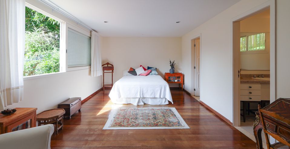 No segundo andar existe a Suíte Master, que é super espaçosa, com dois banheiros completos na suíte, circulação com armários, e um outro quarto amplo, usado como escritório.