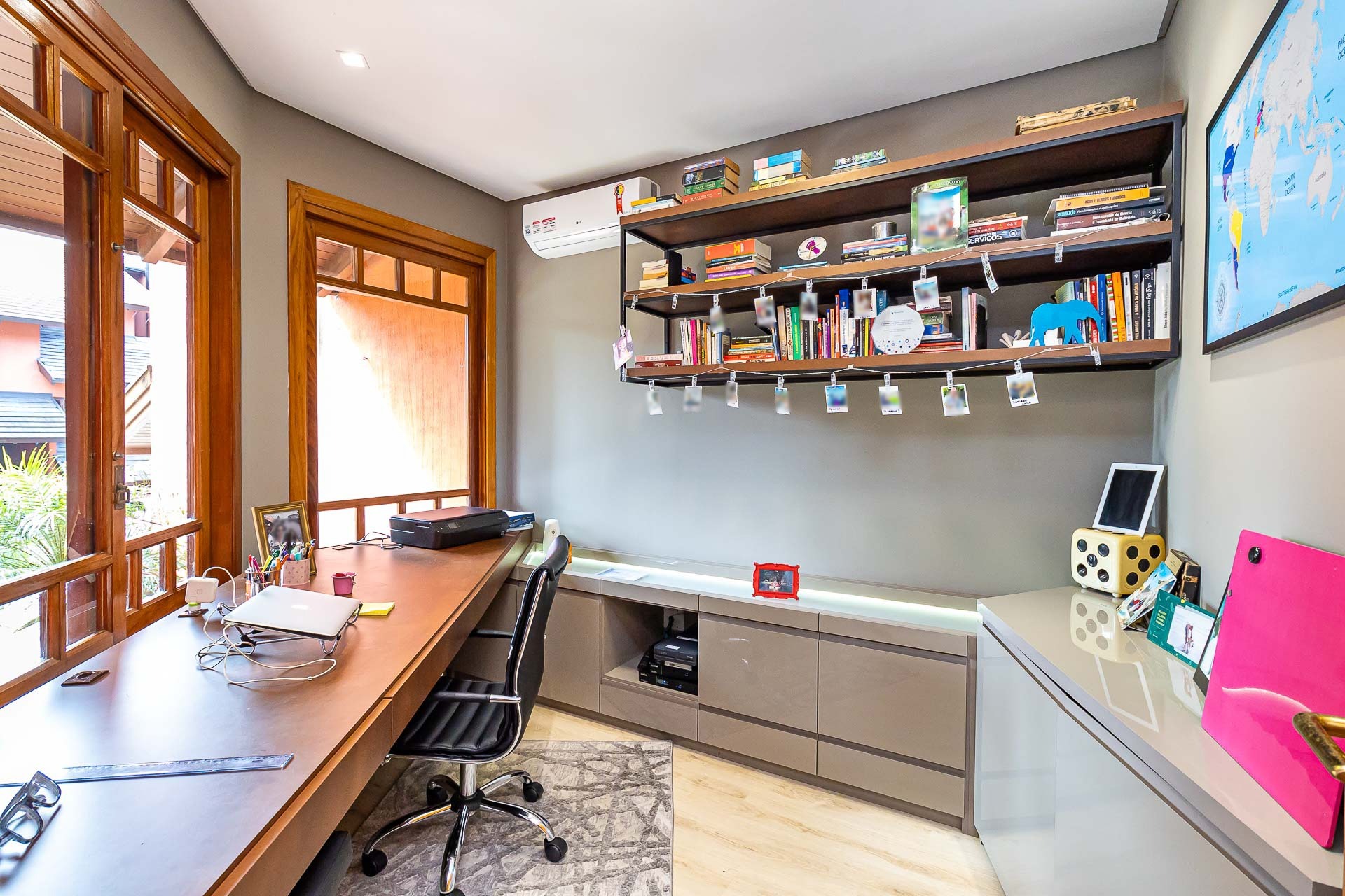 Pavimento inferior com área de serviços, academia, banheiro e opção para o quarto dormitório, além de um depósito que serve de oficina/marcenaria. Garagem coberta para 2 carros.