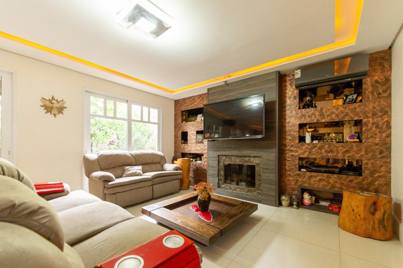 Amplo living com 3 ambientes com lareira, voltado para uma linda área de preservação permanente e panorâmica, churrasqueira gourmet integrada ao living, lavabo, copa cozinha, area de serviço e banheiro auxiliar.