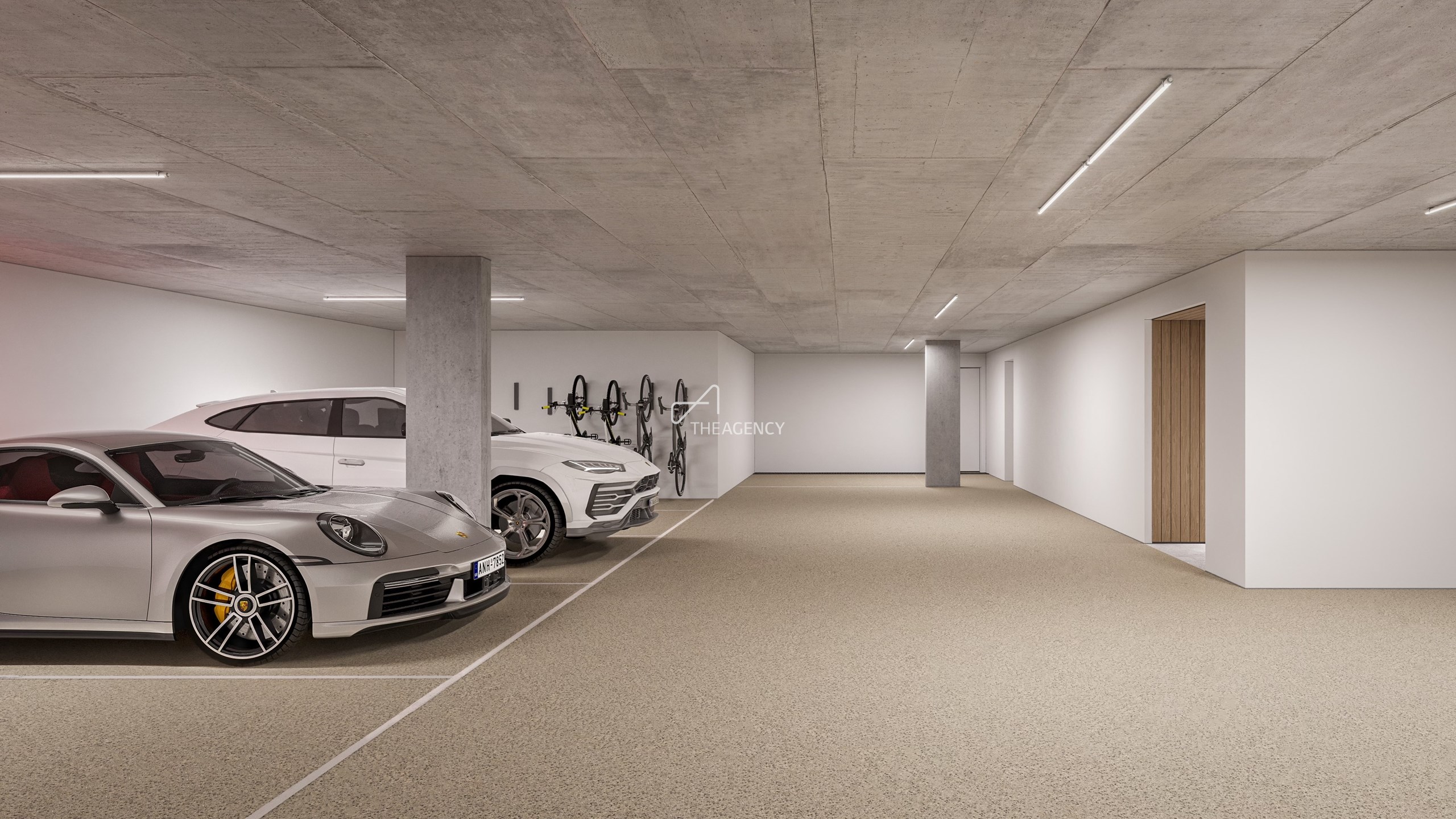 Garagem com 168 m² para até 5 viaturas, equipada com 2 carregadores elétricos, zona para bicicletas e área de lavagem para animais. Inclui ainda garrafeira climatizada, arrecadações, sala técnica e área de gestão de resíduos.