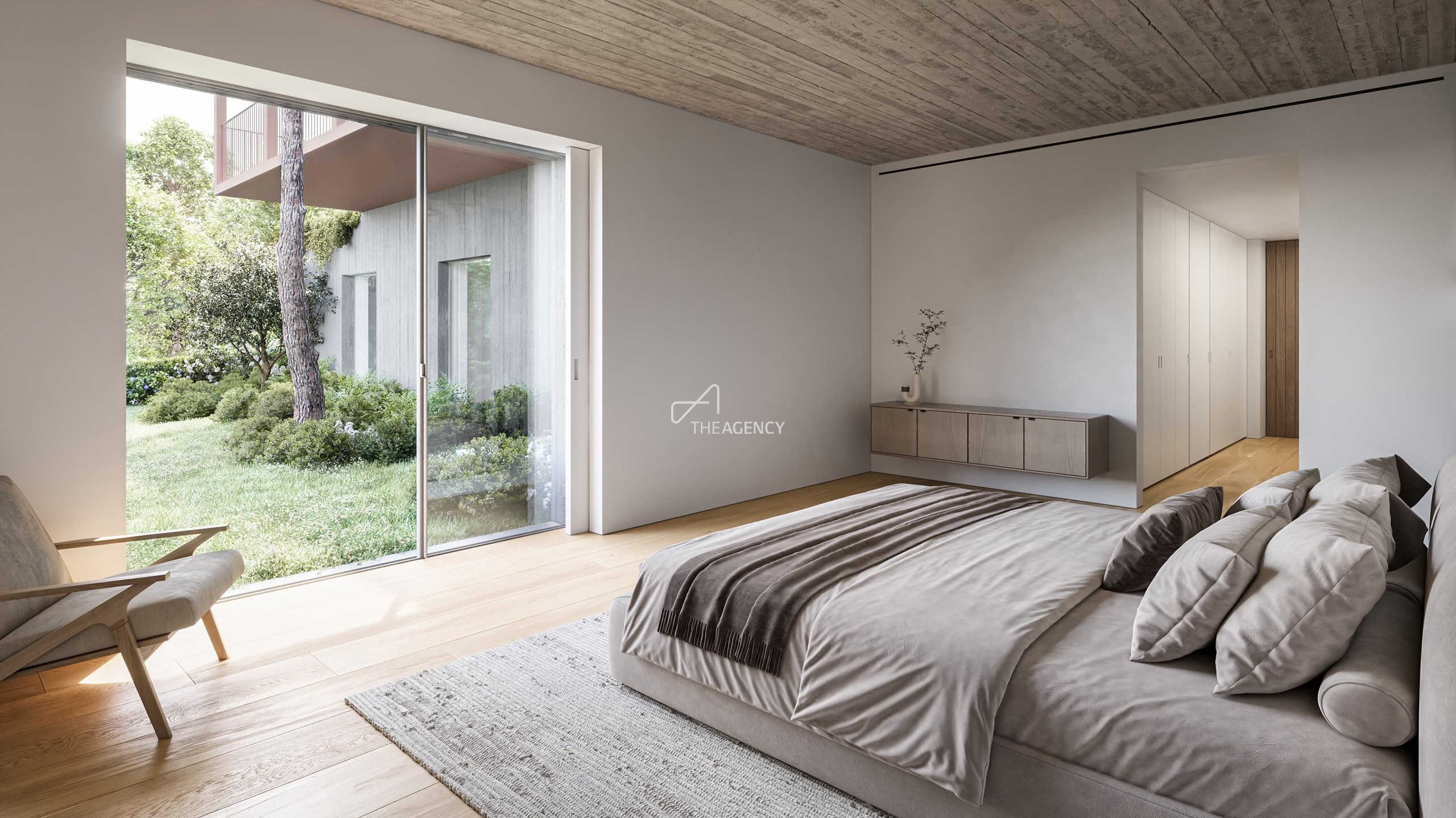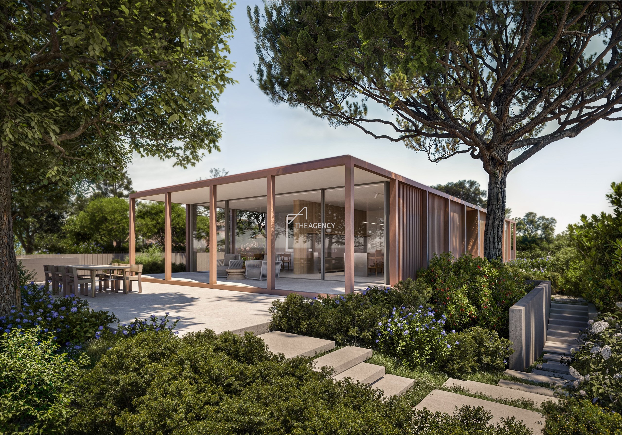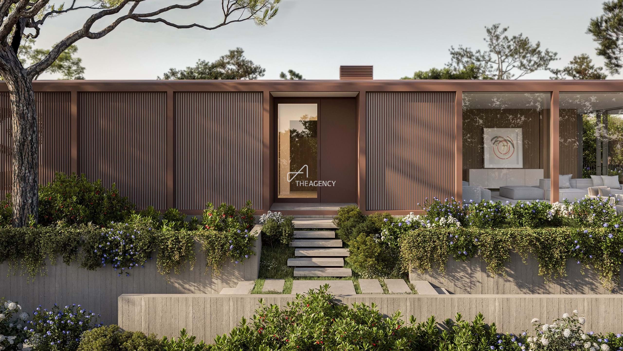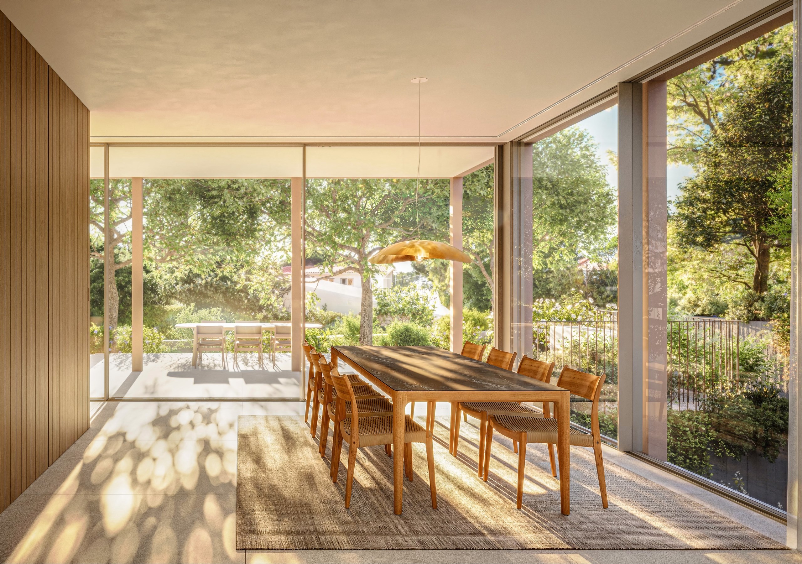 O projeto privilegia geometrias puras, grandes envidraçados e uma criteriosa seleção de materiais naturais pedra, madeira e superfícies metálicas que evoluem com a luz e o tempo, conferindo intemporalidade, conforto e sofisticação discreta.