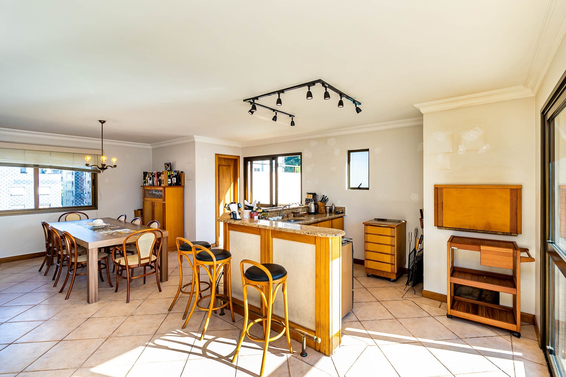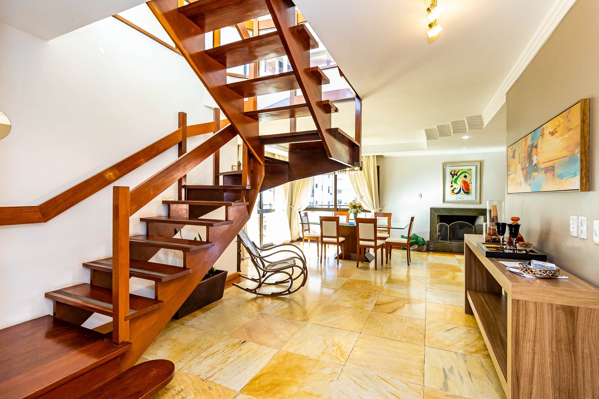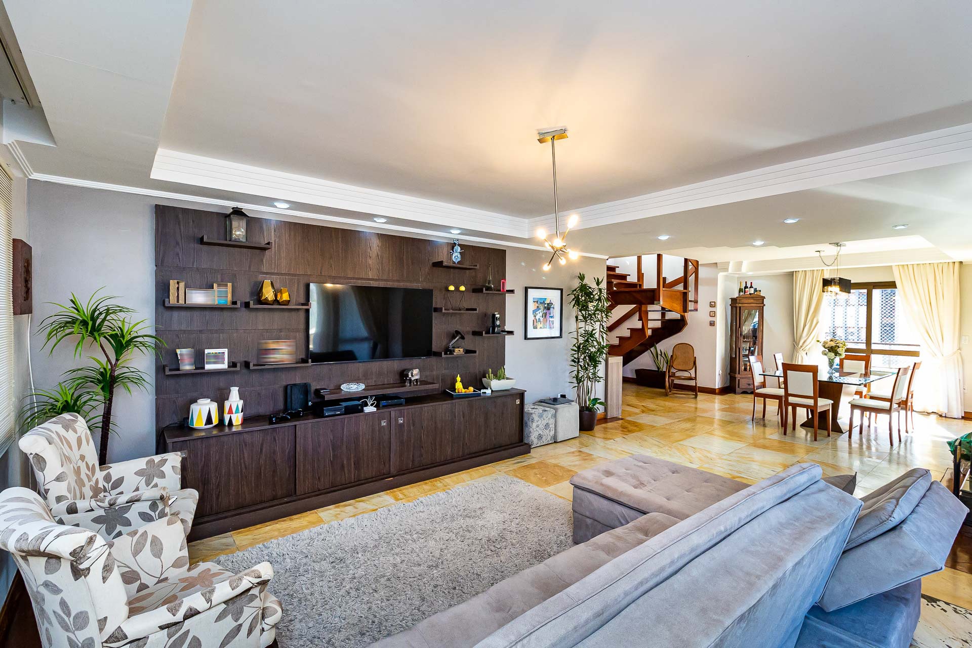 Amplo living com 3 ambientes com lareira, voltado para uma linda área de preservação permanente e panorâmica, churrasqueira gourmet integrada ao living, lavabo, copa cozinha, area de serviço e banheiro auxiliar.