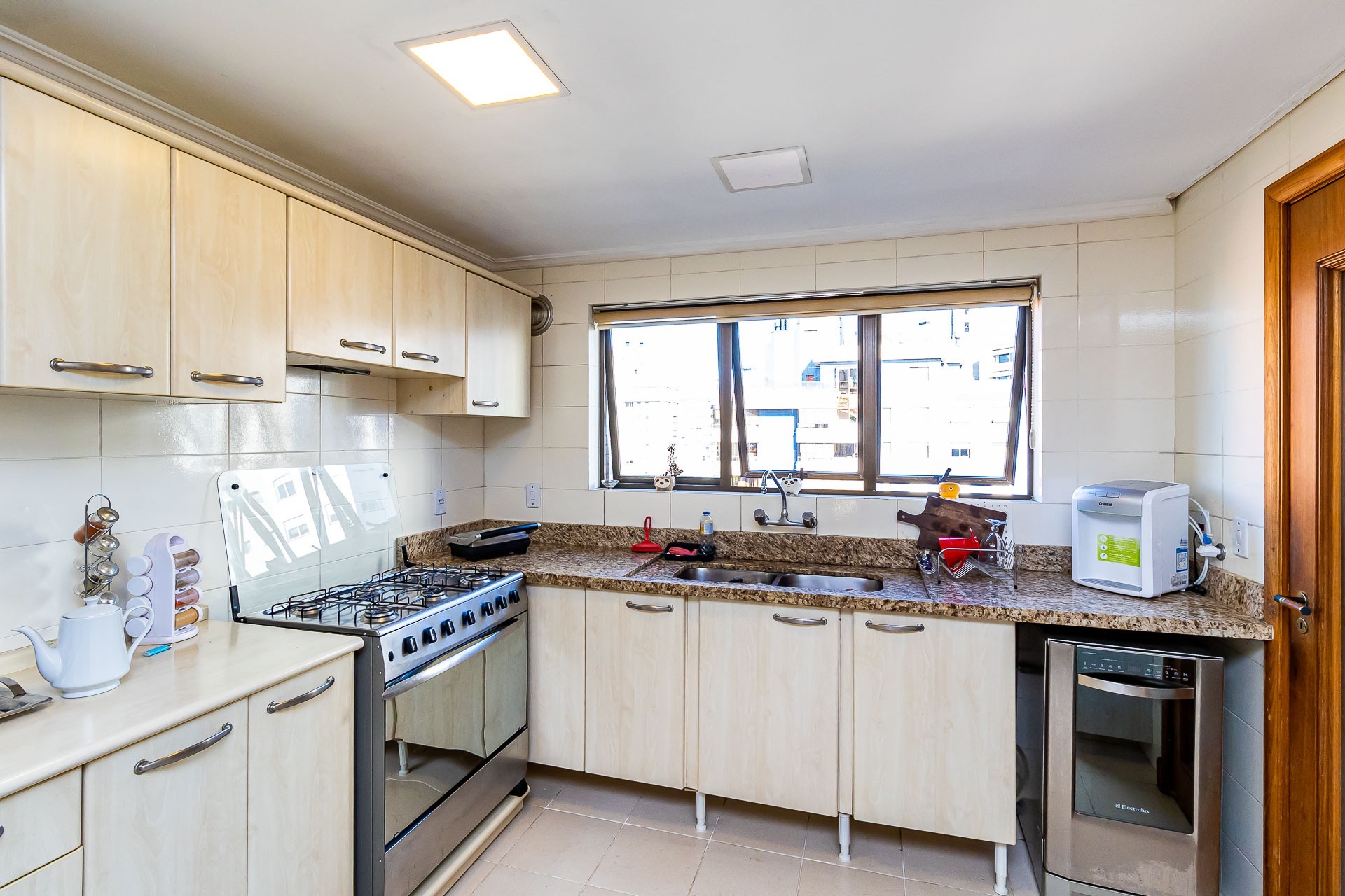 Apartamento para alugar mobiliado com 4 dormitórios, sendo 2 suítes, 179m de área privativa, living com ar condicionado, sacada fechada e ampla com churrasqueira, escrivaninha, cômodas, ventiladores de teto e cortinas, banheiro social com armários, cozinha completa com armários, fogão, geladeira, micro-ondas e coifa e área de serviço.