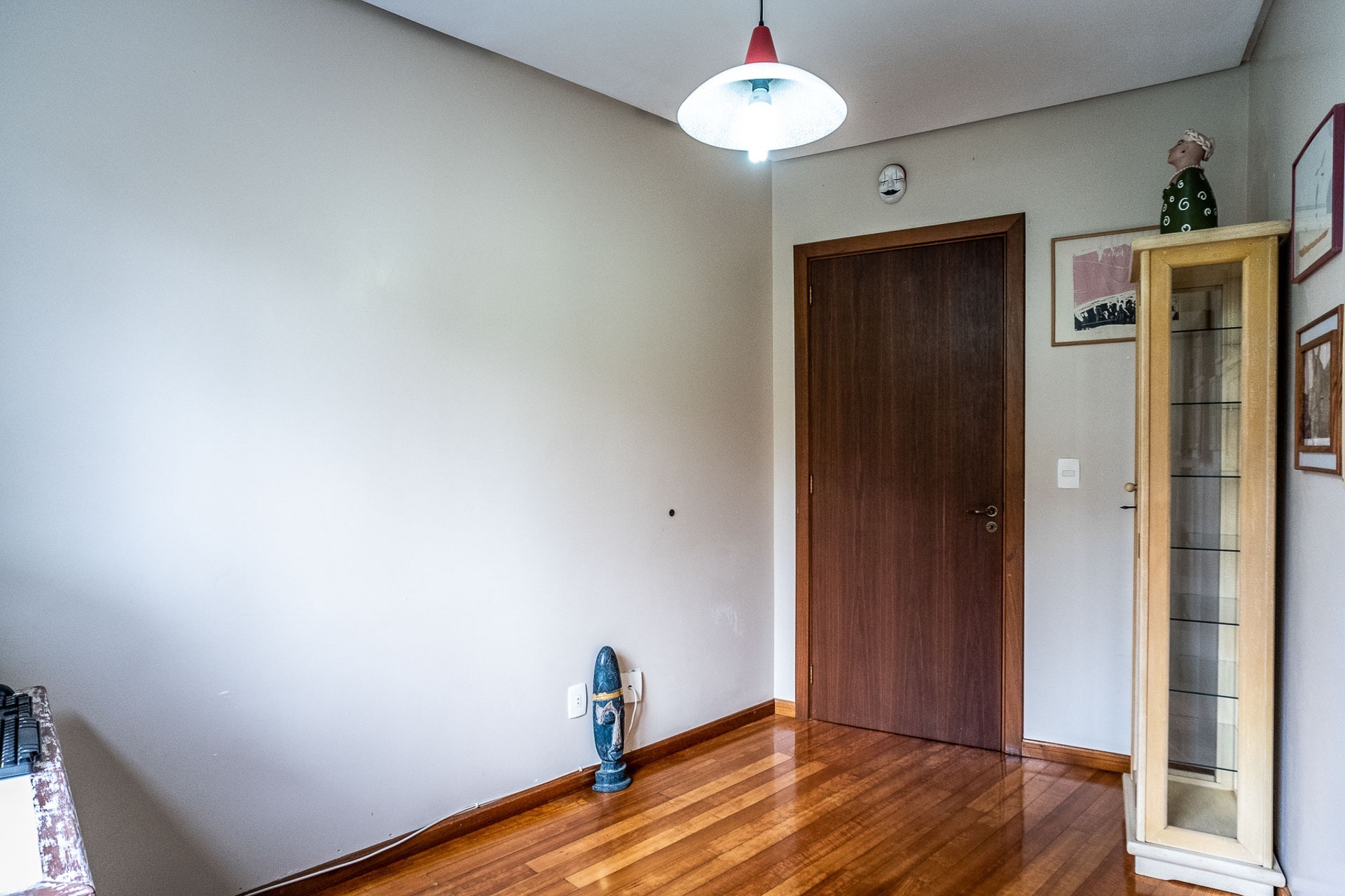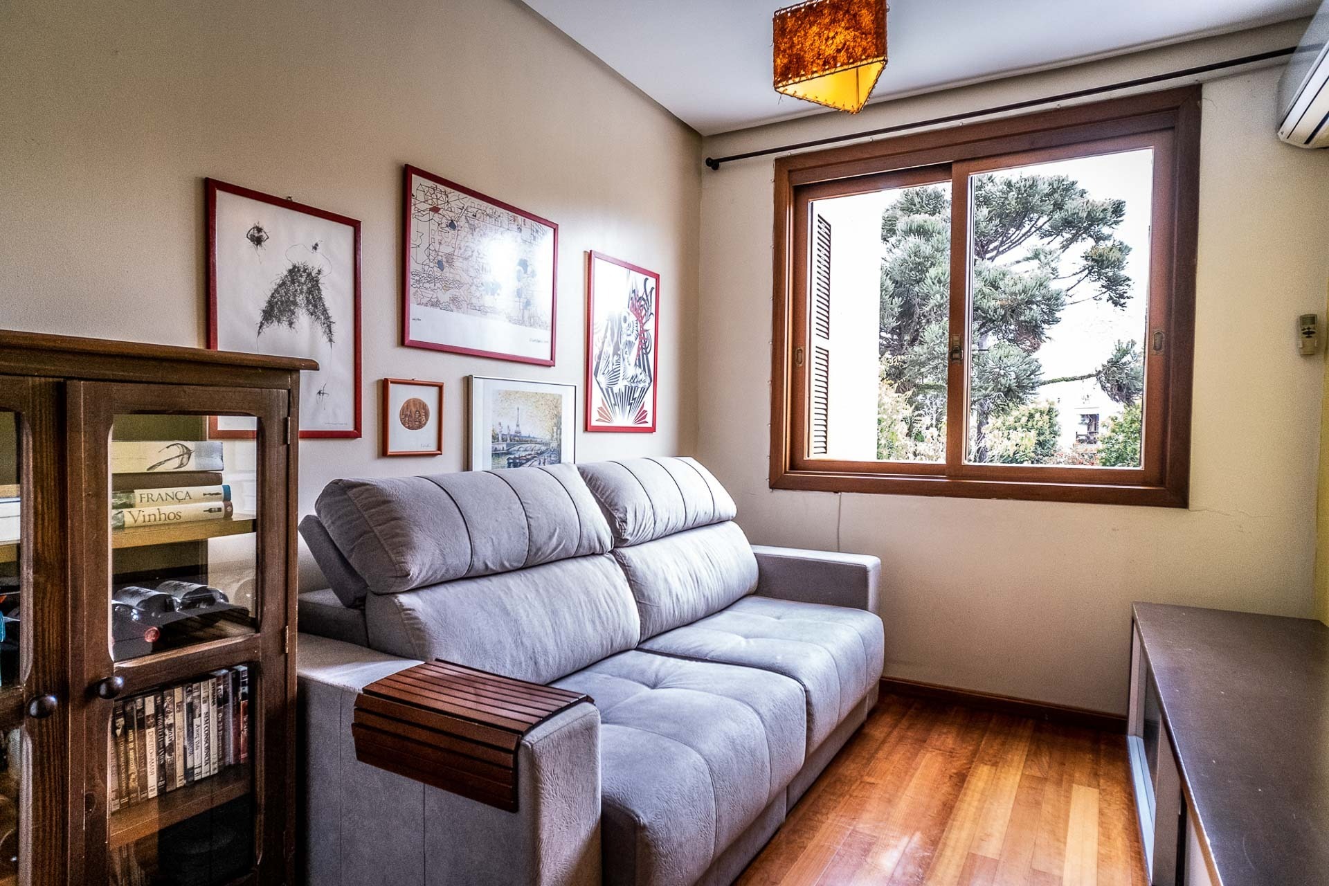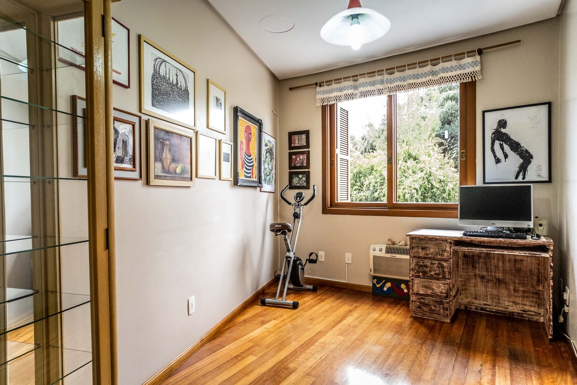 Pavimento inferior com área de serviços, academia, banheiro e opção para o quarto dormitório, além de um depósito que serve de oficina/marcenaria. Garagem coberta para 2 carros.