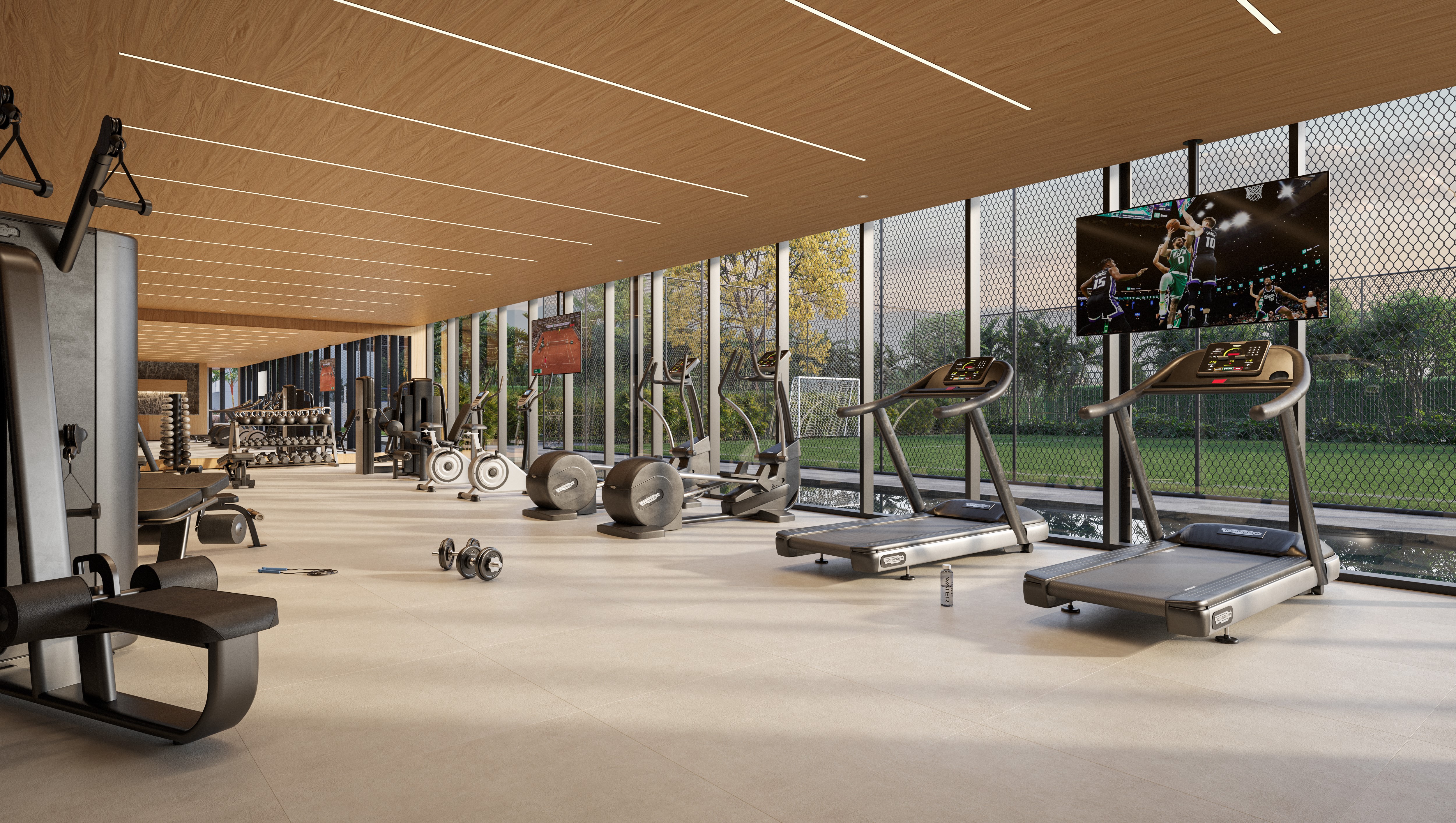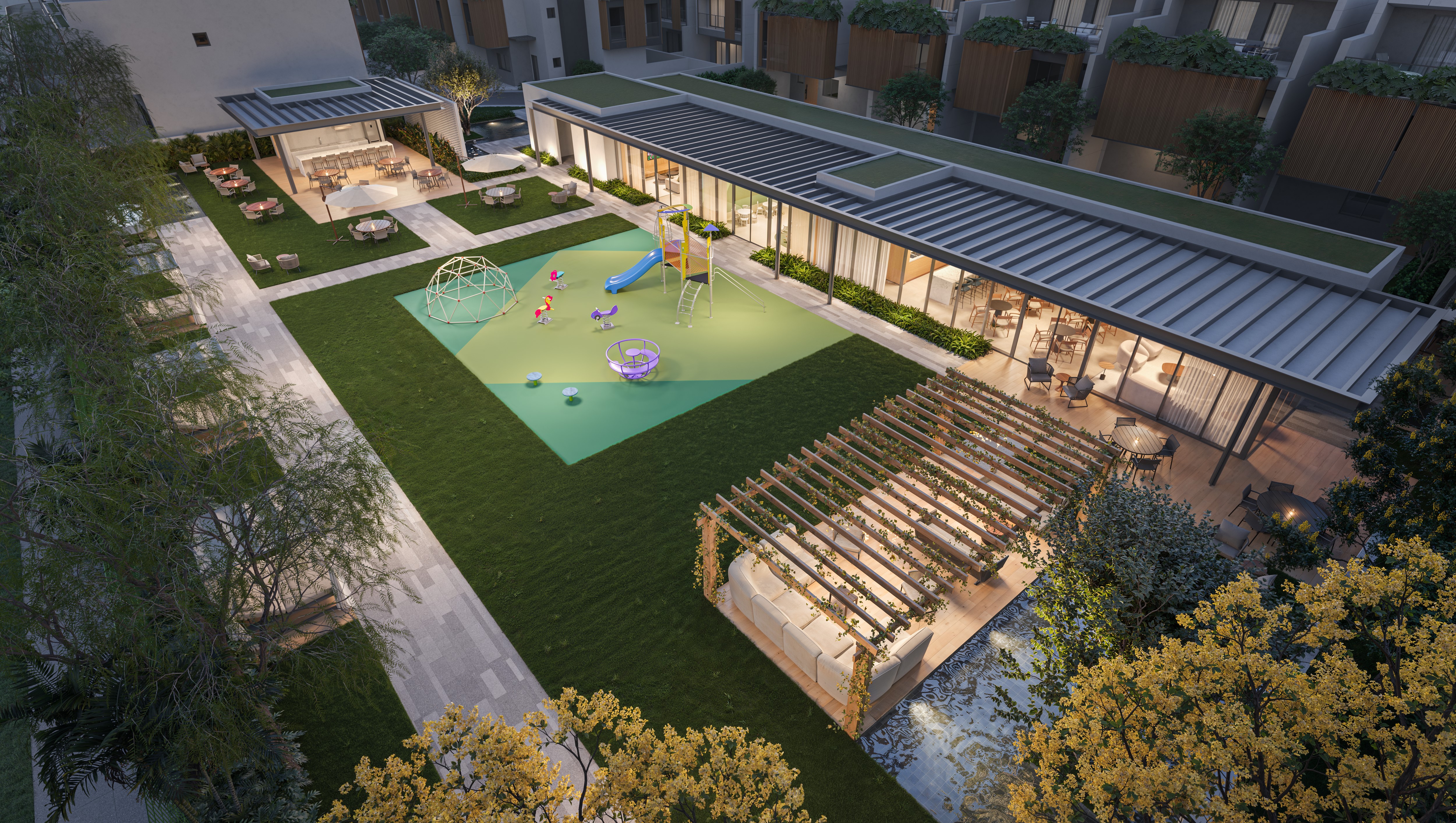 Áreas de lazer ao ar livre, como quadras esportivas ou pistas de caminhada