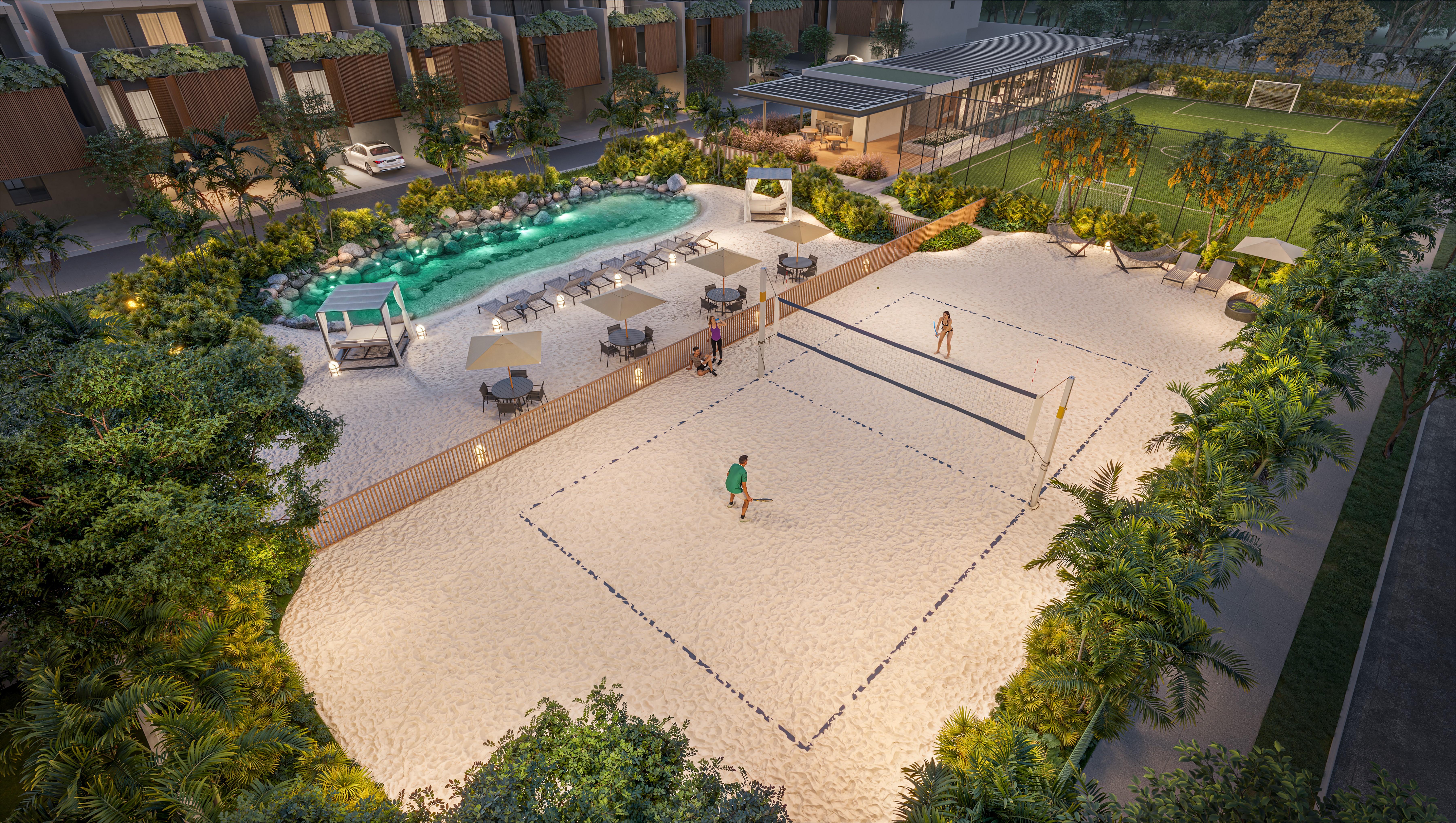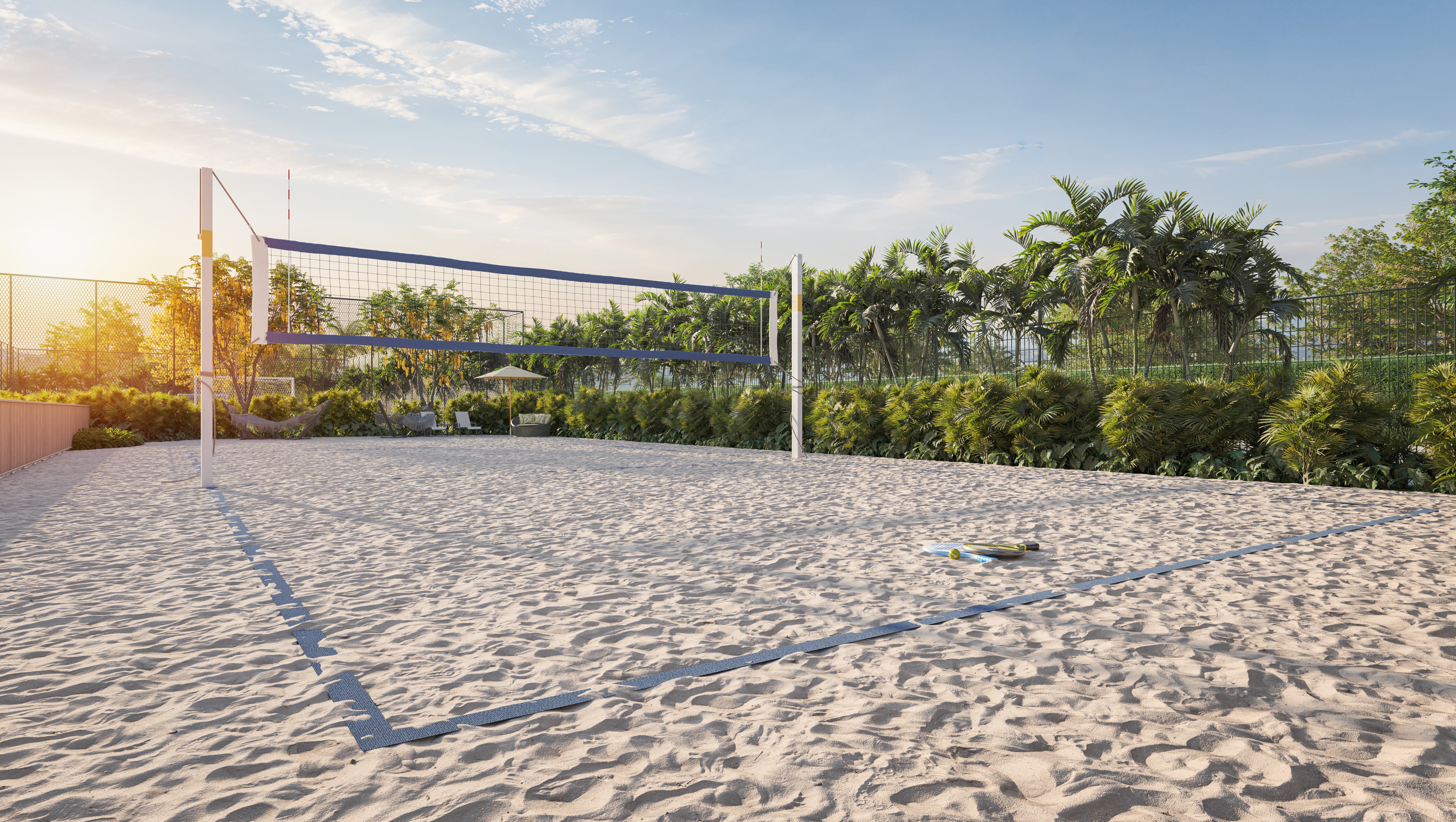 Área de lazer com mais de 4400m² com prainha, quadra de areia, churrasqueiras, academia com 150m² e muito mais para você curtir com a família e amigos.